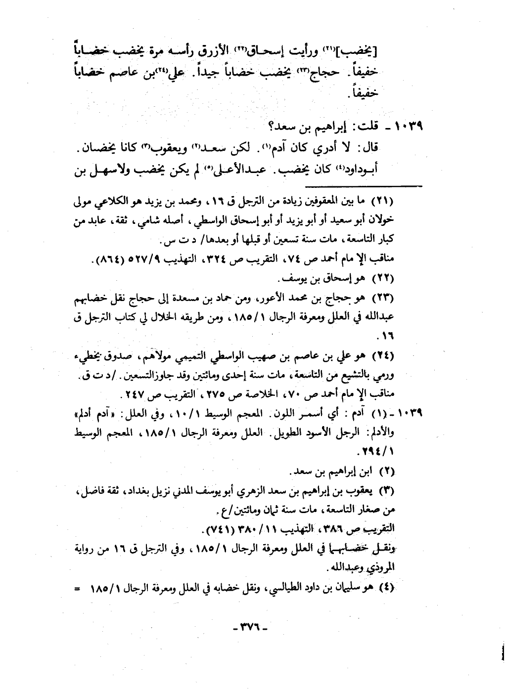1039 - قلت إِبْرَاهِيم بن سعد قَالَ لَا ادري كَانَ آدم لَكِن سعد وَيَعْقُوب كَانَا يخضبان أَبُو دَاوُد كَانَ يخضب عبد الْأَعْلَى لم يكن يخضب وَلَا سهل بن