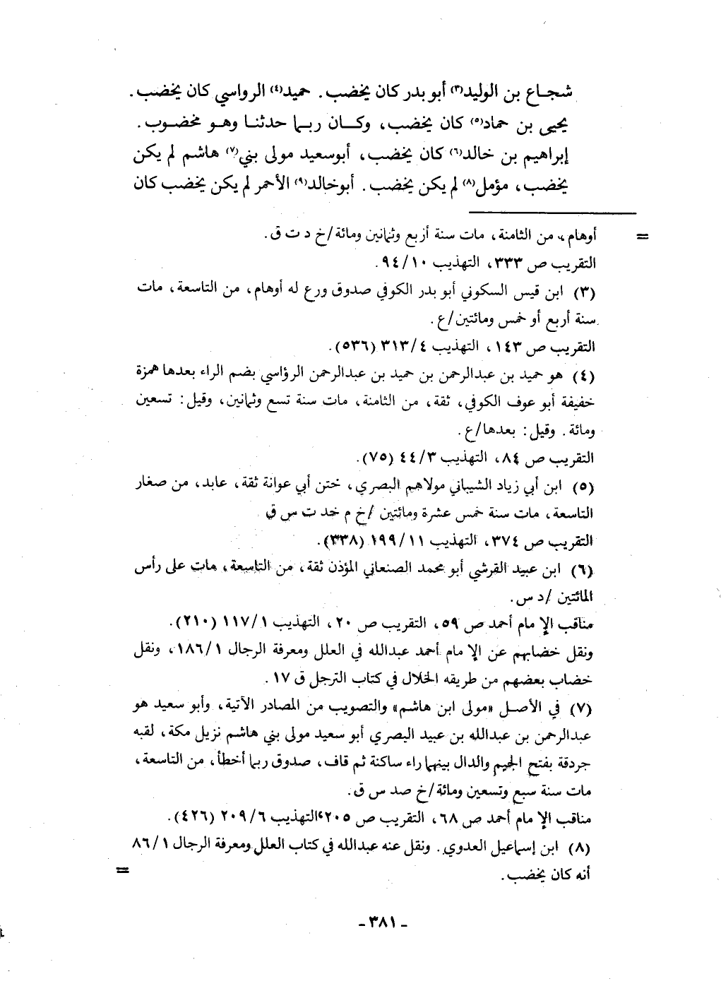 شُجَاع بن الْوَلِيد أَبُو بدر كَانَ يخضب حميد الرواسِي كَانَ يخضب يحيى بن حَمَّاد كَانَ يخضب وَكَانَ رُبمَا حَدثنَا وَهُوَ مخضوب إِبْرَاهِيم بن خَالِد كَانَ يخضب أَبُو سعيد مولى بني هَاشم لم يكن يخضب مُؤَمل لم يكن يخضب أَبُو خَالِد الْأَحْمَر لم يكن يخضب كَانَ