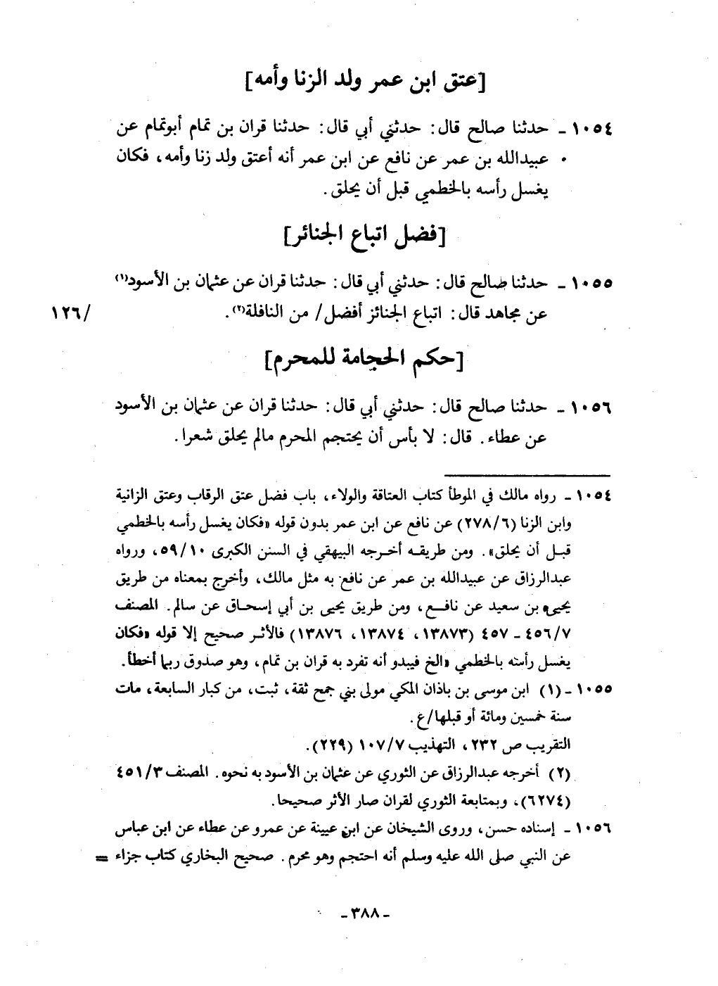 1054 - حَدثنَا صَالح قَالَ حَدثنِي أبي قَالَ حَدثنَا قرَان بن تَمام أَبُو تَمام عَن عبيد الله بن عمر عَن نَافِع عَن ابْن عمر أَنه أعتق ولد زنا وَأمه فَكَانَ يغسل رَأسه بالخطمي قبل أَن يحلق