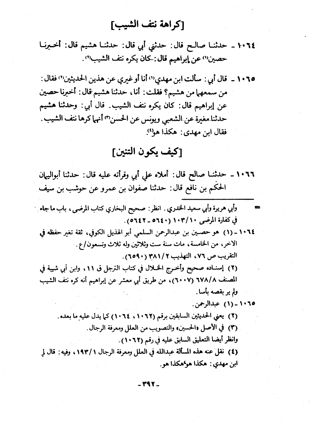 1065 - قَالَ أبي سَأَلت ابْن مهْدي أَنا أَو غَيْرِي عَن هذَيْن الْحَدِيثين فَقَالَ من سمعهما من هشيم فَقلت أَنا حَدثنَا هشيم قَالَ أخبرنَا حُصَيْن عَن إِبْرَاهِيم قَالَ كَانَ يكره نتف الشيب قَالَ أبي وَحدثنَا هشيم حَدثنَا مُغيرَة عَن الشّعبِيّ وَيُونُس عَن الْحسن أَنَّهُمَا كرها نتف الشيب فَقَالَ ابْن مهْدي هَكَذَا هُوَ