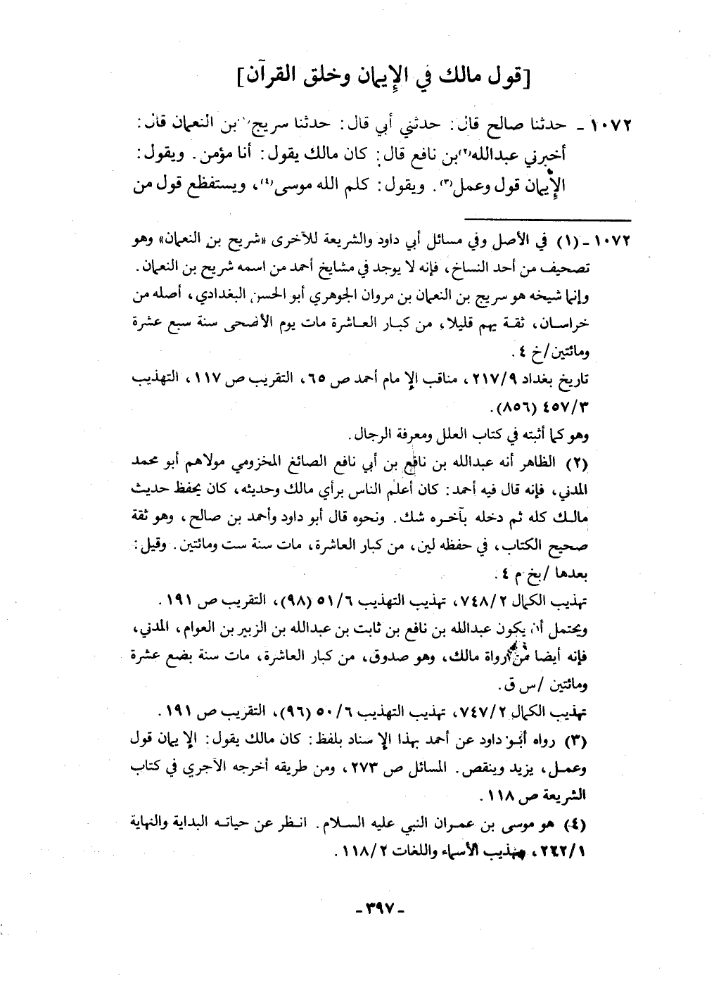 1072 - حَدثنَا صَالح قَالَ حَدثنِي أبي قَالَ حَدثنَا سُرَيج بن النُّعْمَان قَالَ أَخْبرنِي عبد الله بن نَافِع قَالَ كَانَ مَالك يَقُول أَنا مُؤمن وَيَقُول الْإِيمَان قَول وَعمل وَيَقُول كلم الله مُوسَى ويستفظع قَول من