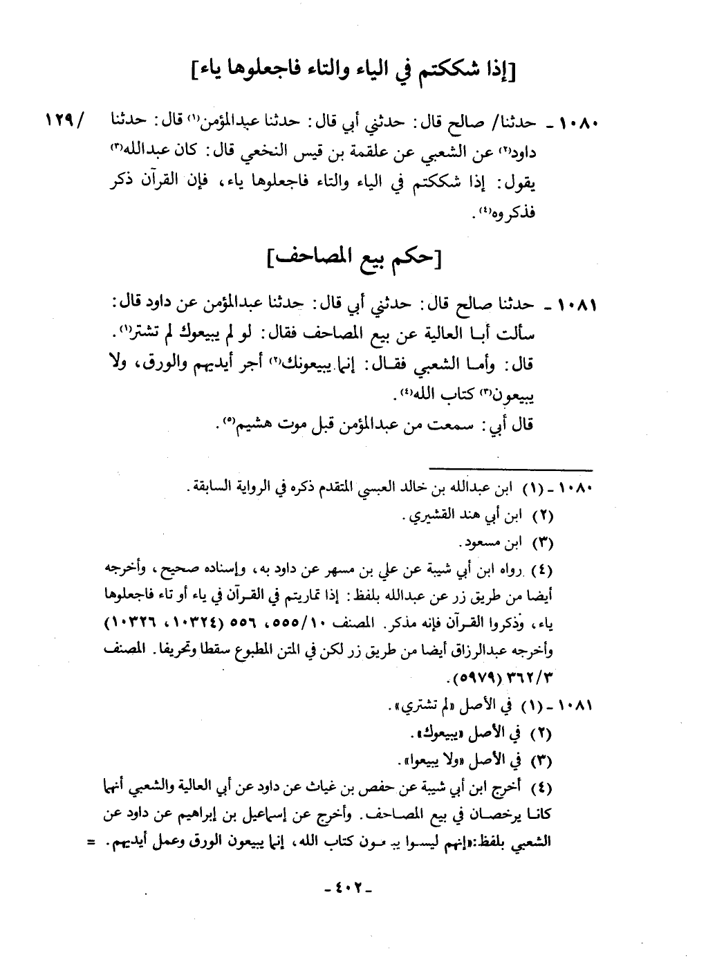 1081 - حَدثنَا صَالح قَالَ حَدثنِي أبي قَالَ حَدثنَا عبد الْمُؤمن عَن دَاوُد قَالَ سَأَلت أَبَا الْعَالِيَة عَن بيع الْمَصَاحِف فَقَالَ لَو لم يبيعوك لم تشتر قَالَ وَأما الشّعبِيّ فَقَالَ إِنَّمَا يبيعونك أجر أَيْديهم وَالْوَرق وَلَا يبيعون كتاب الله قَالَ أبي سَمِعت من عبد الْمُؤمن قبل موت هشيم