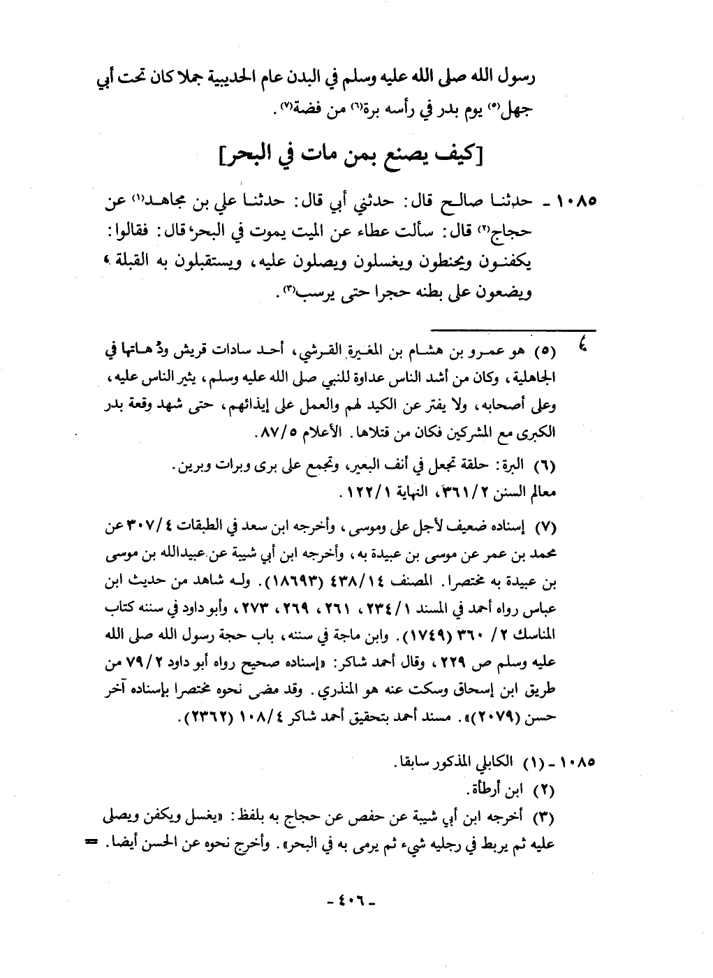 1085 - حَدثنَا صَالح قَالَ حَدثنِي أبي قَالَ حَدثنَا عَليّ بن مُجَاهِد عَن حجاج قَالَ سَأَلت عَطاء عَن الْمَيِّت يَمُوت فِي الْبَحْر قَالَ فَقَالُوا يكفنون ويحنطون ويغسلون وَيصلونَ عَلَيْهِ ويستقبلون بِهِ الْقبْلَة ويضعون على بَطْنه حجرا حَتَّى يرسب