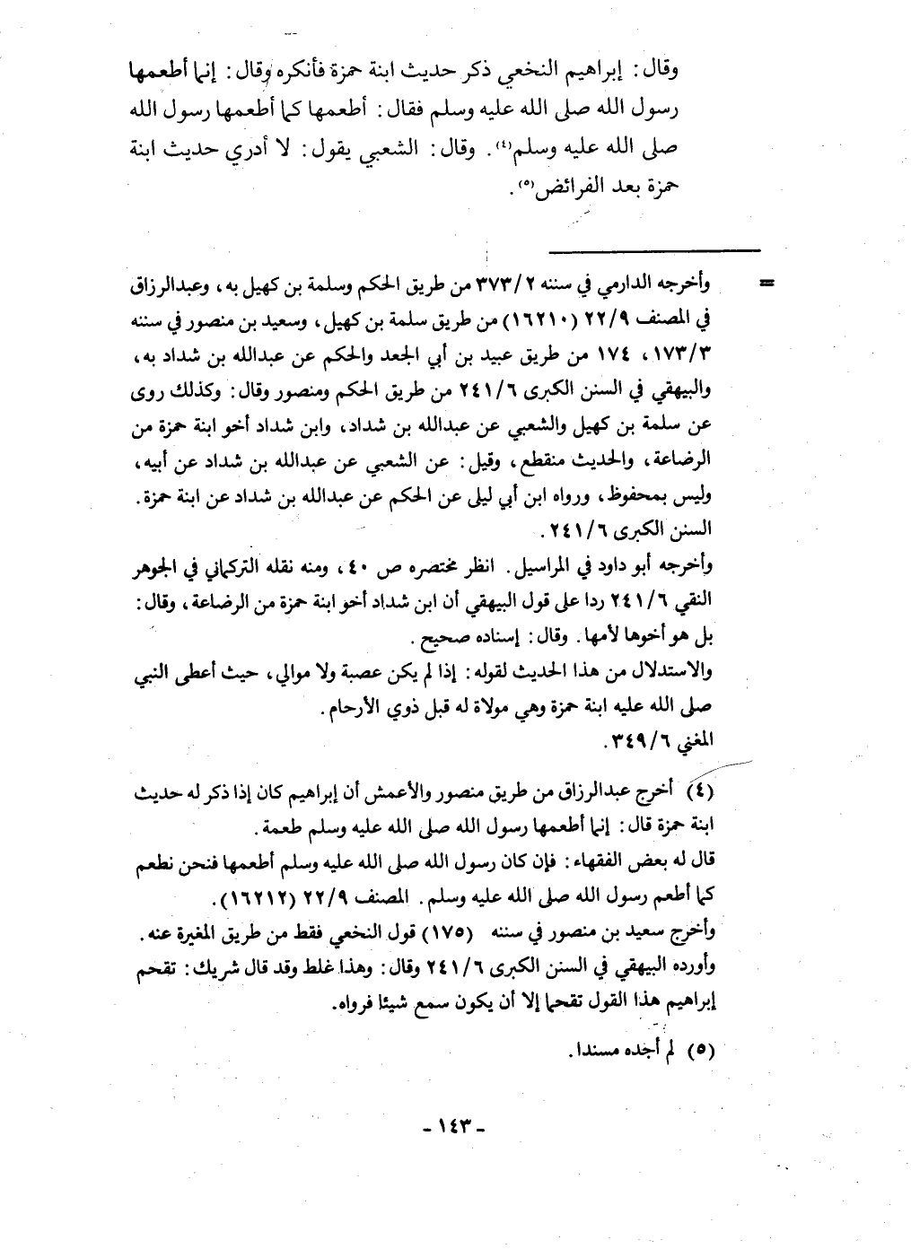 وَقَالَ إِبْرَاهِيم النَّخعِيّ ذكر حَدِيث ابْنة حَمْزَة فَأنكرهُ وَقَالَ إِنَّمَا أطعمها رَسُول الله صلى الله عَلَيْهِ وَسلم فَقَالَ أطعمها كَمَا أطعمها رَسُول الله صلى الله عَلَيْهِ وَسلم وَقَالَ الشّعبِيّ يَقُول لَا أَدْرِي حَدِيث ابْنة حَمْزَة بعد الْفَرَائِض