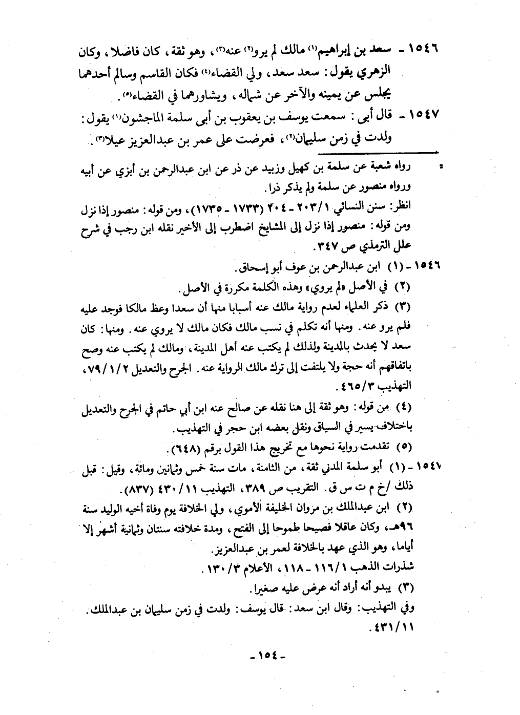 1546 - سعد بن إِبْرَاهِيم مَالك لم يرو عَنهُ وَهُوَ ثِقَة كَانَ فَاضلا وَكَانَ الزُّهْرِيّ يَقُول سعد سعد ولي الْقَضَاء فَكَانَ الْقَاسِم وَسَالم أَحدهمَا يجلس عَن يَمِينه وَالْآخر عَن شِمَاله ويشاورهما فِي الْقَضَاء