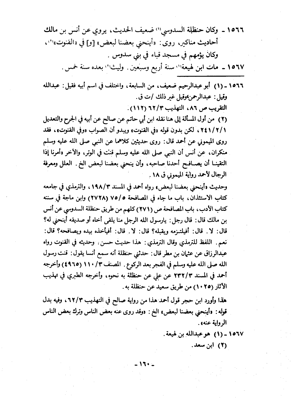 1566 - وَكَانَ حَنْظَلَة السدُوسِي ضَعِيف الحَدِيث يروي عَن أنس بن مَالك أَحَادِيث مَنَاكِير روى أينحني بَعْضنَا لبَعض وَفِي الْقُنُوت وَكَانَ يؤمهم فِي مَسْجِد قبَاء فِي بني سدوس