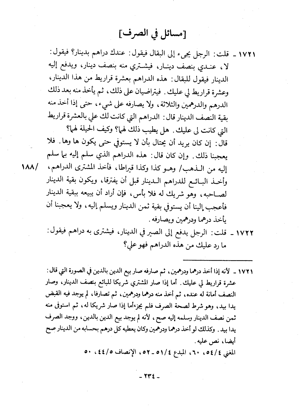 1721 - قلت الرجل يجِئ إِلَى الْبَقَّال فَيَقُول عنْدك دَرَاهِم بِدِينَار فَيَقُول لَا عِنْدِي بِنصْف دِينَار فيشتري مِنْهُ بِنصْف دِينَار وَيدْفَع إِلَيْهِ الدِّينَار فَيَقُول للبقال هَذِه الدَّرَاهِم بِعشْرَة قراريط من هَذَا الدِّينَار وَعشرَة قراريط لي عَلَيْك فيتراضيان على ذَلِك ثمَّ يَأْخُذ مِنْهُ بعد ذَلِك الدِّرْهَم وَالدِّرْهَمَيْنِ وَالثَّلَاثَة وَلَا يصارفه على شَيْء حَتَّى إِذا أَخذ مِنْهُ بَقِيَّة النّصْف الدِّينَار قَالَ الدَّرَاهِم الَّتِي كَانَت لَك عَليّ بِالْعشرَةِ قراريط الَّتِي كَانَت لي عَلَيْك هَل يطيب ذَلِك لَهما وَكَيف الْحِيلَة لَهما