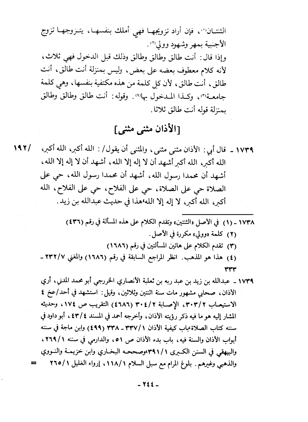 1739 - قَالَ أبي الْأَذَان مثنى مثنى والمثنى أَن يَقُول الله أكبر الله أكبر الله أكبر الله أكبر أشهد أَن لَا إِلَه إِلَّا الله أشهد أَن لَا إِلَه إِلَّا الله أشهد أَن مُحَمَّدًا رَسُول الله أشهد أَن مُحَمَّدًا رَسُول الله حَيّ على الصَّلَاة حَيّ على الصَّلَاة حَيّ على الْفَلاح حَيّ على الْفَلاح الله أكبر الله أكبر لَا إِلَه إِلَّا الله هَذَا فِي حَدِيث عبد الله بن زيد