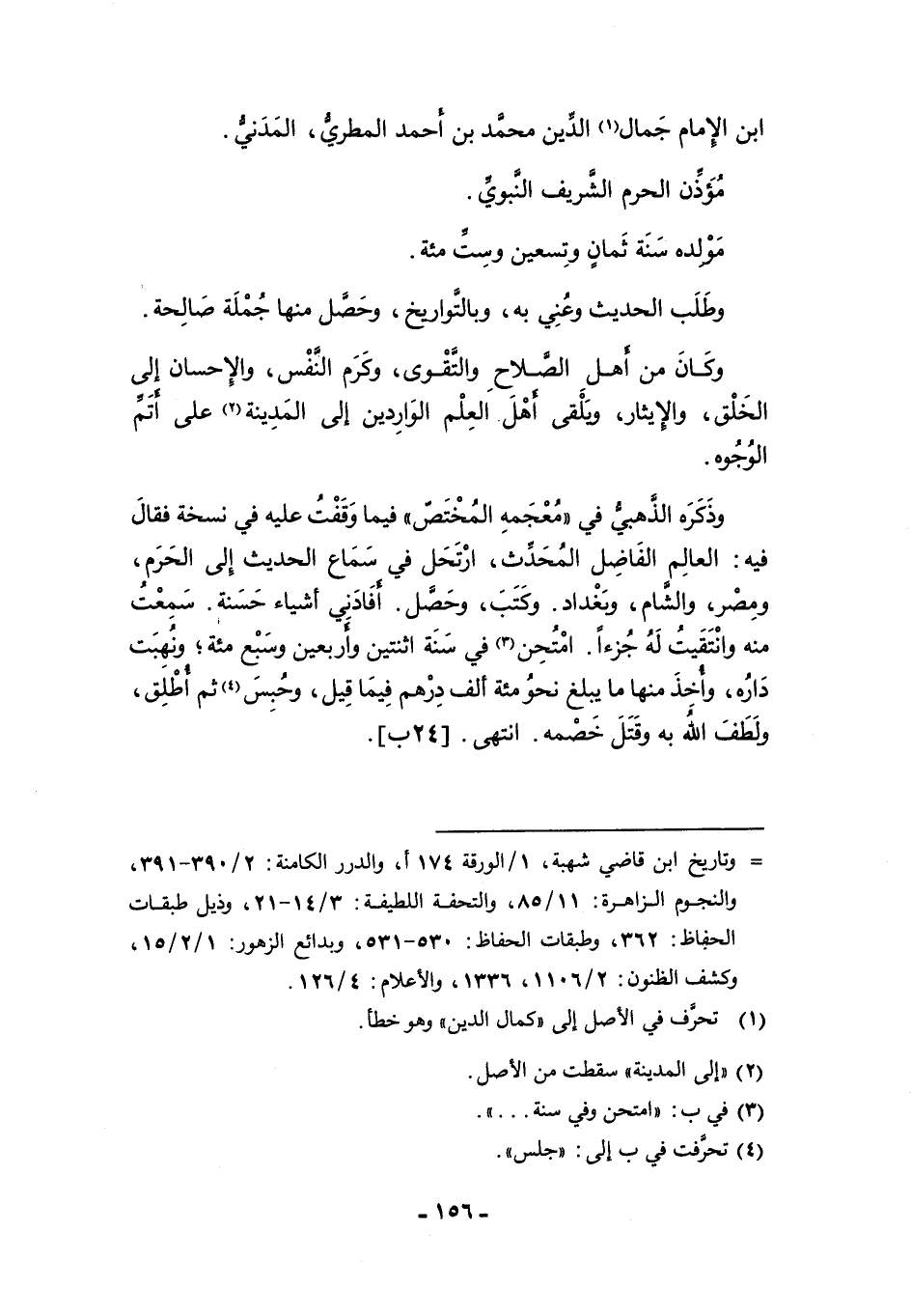 وذكره الذّهبيّ في «معجمه المختصّ» فيما وقفت عليه في نسخة فقال فيه: العالم الفاضل المحدّث، ارتحل في سماع الحديث إلى الحرم، ومصر، والشّام، وبغداد. وكتب، وحصّل. أفادني أشياء حسنة. سمعت منه وانتقيت له جزءا. امتحن (¬٣) في سنة اثنتين وأربعين وسبع مئة؛ ونهبت داره، وأخذ منها ما يبلغ نحو مئة ألف درهم فيما قيل، وحبس (¬٤) ثم أطلق، ولطف الله به وقتل خصمه. انتهى. [٢٤ ب].