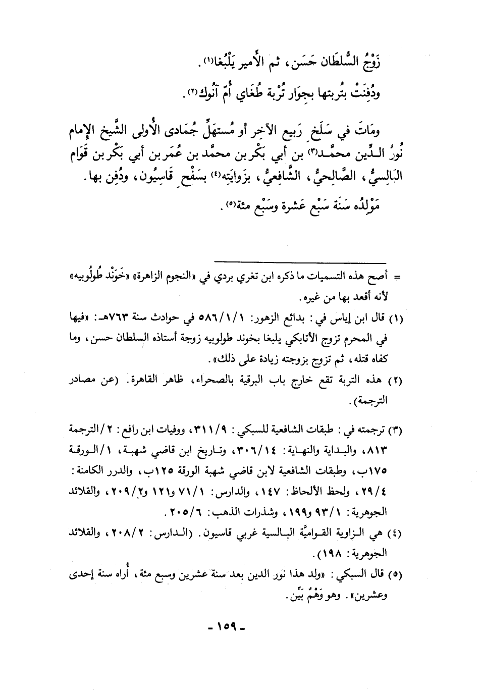 (¬٥) قال السبكي: «ولد هذا نور الدين بعد سنة عشرين وسبع مئة، أراه سنة إحدى وعشرين». وهو وهم بيّن.