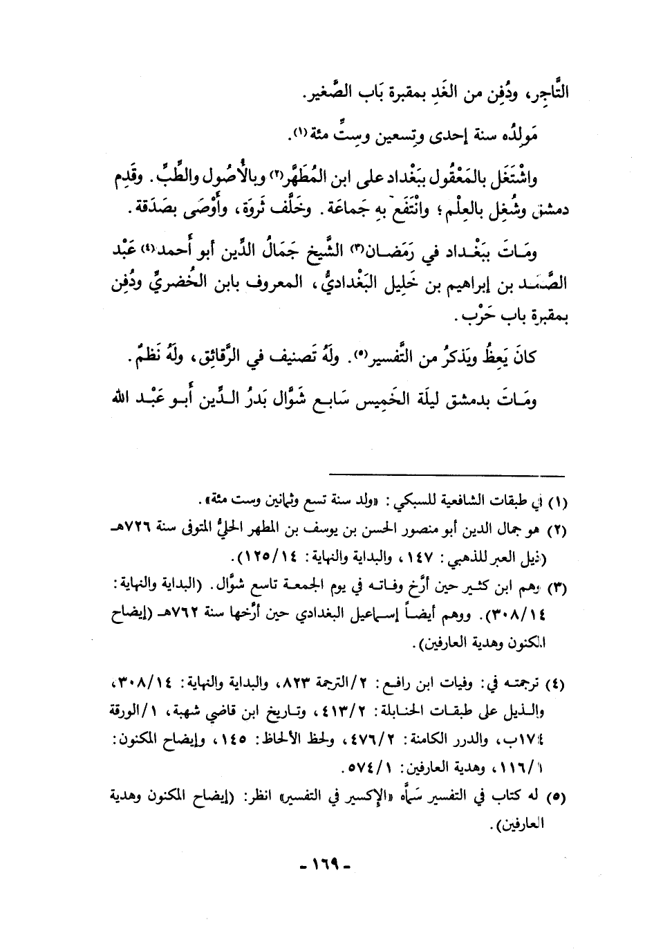 (¬٣) وهم ابن كثير حين أرّخ وفاته في يوم الجمعة تاسع شوّال. (البداية والنهاية: ١٤/ ٣٠٨). ووهم أيضا إسماعيل البغدادي حين أرّخها سنة ٧٦٢ هـ (إيضاح المكنون وهدية العارفين).