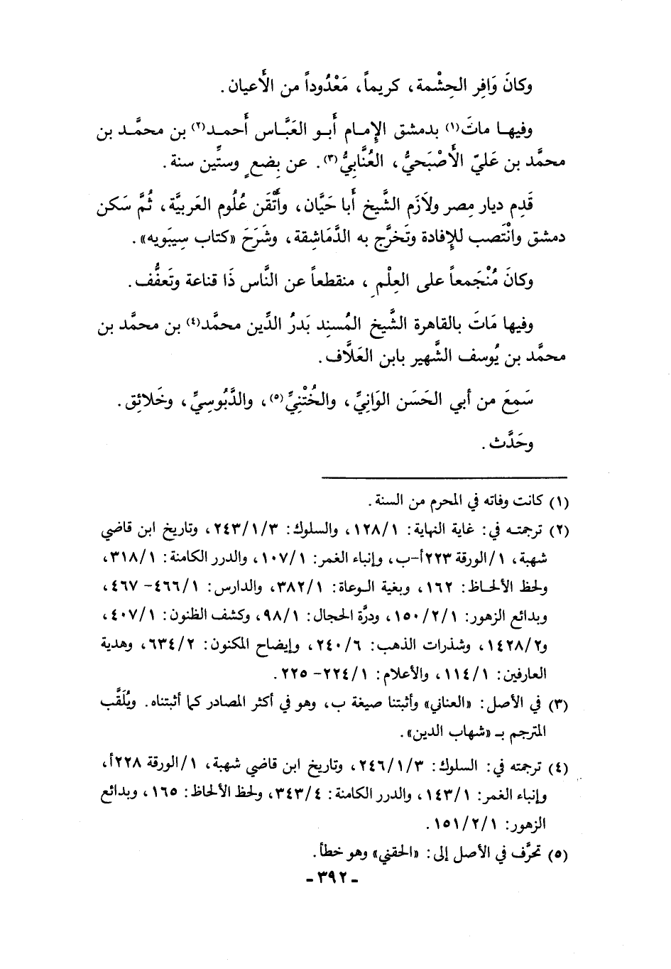 (¬٢) ترجمته في: غاية النهاية: ١/ ١٢٨، والسلوك: ٣/ ١/٢٤٣، وتاريخ ابن قاضي شهبة، ١/الورقة ٢٢٣ أ-ب، وإنباء الغمر: ١/ ١٠٧، والدرر الكامنة: ١/ ٣١٨، ولحظ الألحاظ: ١٦٢، وبغية الوعاة: ١/ ٣٨٢، والدارس: ١/ ٤٦٦ - ٤٦٧، وبدائع الزهور: ١/ ٢/١٥٠، ودرّة الحجال: ١/ ٩٨، وكشف الظنون: ١/ ٤٠٧، و ٢/ ١٤٢٨، وشذرات الذهب: ٦/ ٢٤٠، وإيضاح المكنون: ٢/ ٦٣٤، وهدية العارفين: ١/ ١١٤، والأعلام: ١/ ٢٢٤ - ٢٢٥.