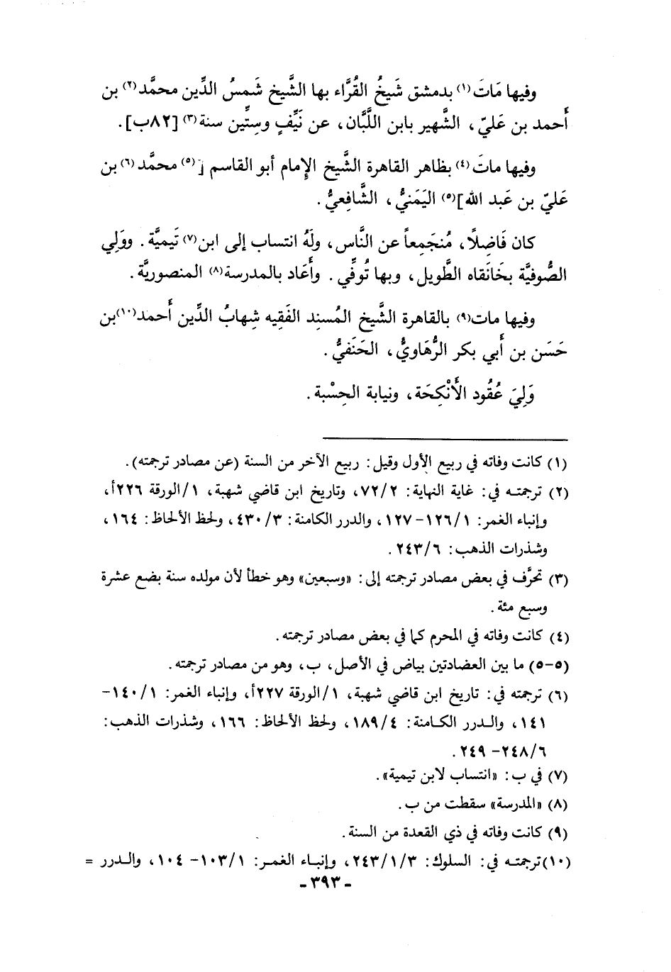 (¬٦) ترجمته في: تاريخ ابن قاضي شهبة، ١/الورقة ٢٢٧ أ، وإنباء الغمر: ١/ ١٤٠ - ١٤١، والدرر الكامنة: ٤/ ١٨٩، ولحظ الألحاظ: ١٦٦، وشذرات الذهب: ٦/ ٢٤٨ - ٢٤٩.