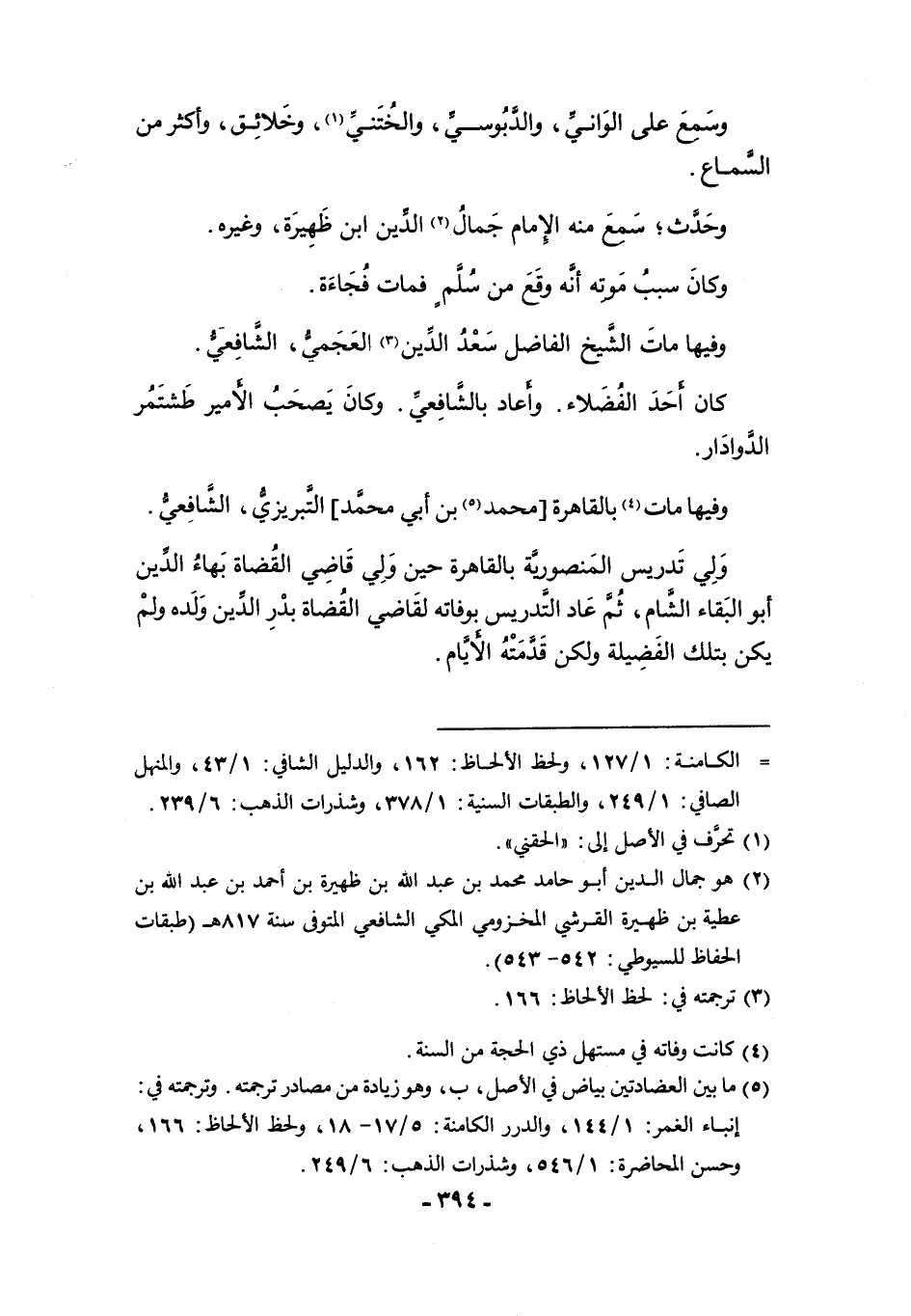 (¬٥) ما بين العضادتين بياض في الأصل، ب، وهو زيادة من مصادر ترجمته. وترجمته في: إنباء الغمر: ١/ ١٤٤، والدرر الكامنة: ٥/ ١٧ - ١٨، ولحظ الألحاظ: ١٦٦، وحسن المحاضرة: ١/ ٥٤٦، وشذرات الذهب: ٦/ ٢٤٩.