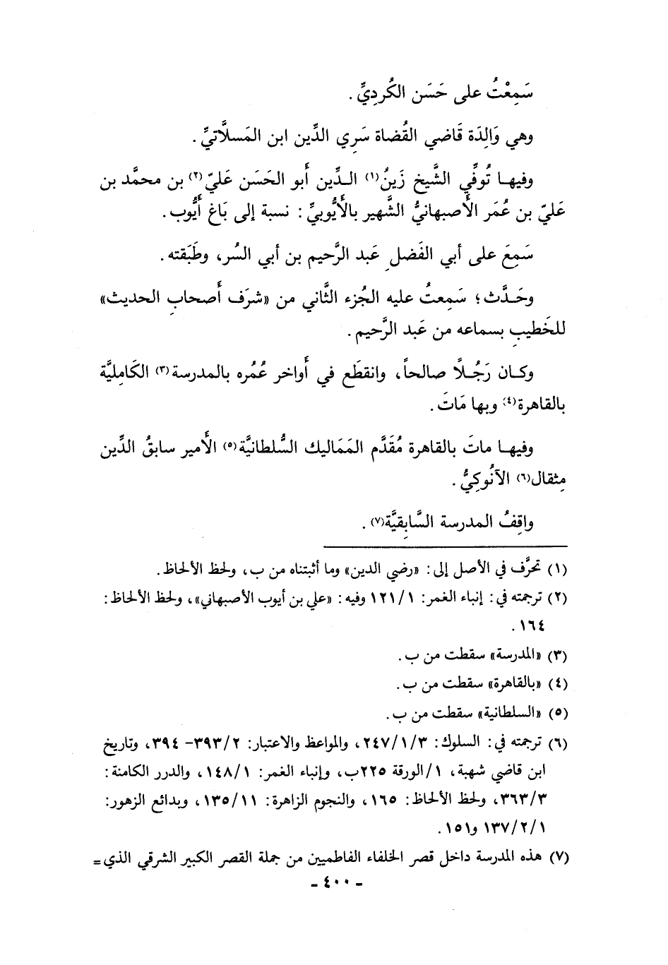 (¬٦) ترجمته في: السلوك: ٣/ ١/٢٤٧، والمواعظ والاعتبار: ٢/ ٣٩٣ - ٣٩٤، وتاريخ ابن قاضي شهبة، ١/الورقة ٢٢٥ ب، وإنباء الغمر: ١/ ١٤٨، والدرر الكامنة: ٣/ ٣٦٣، ولحظ الألحاظ: ١٦٥، والنجوم الزاهرة: ١١/ ١٣٥، وبدائع الزهور: ١/ ٢/١٣٧ و ١٥١.