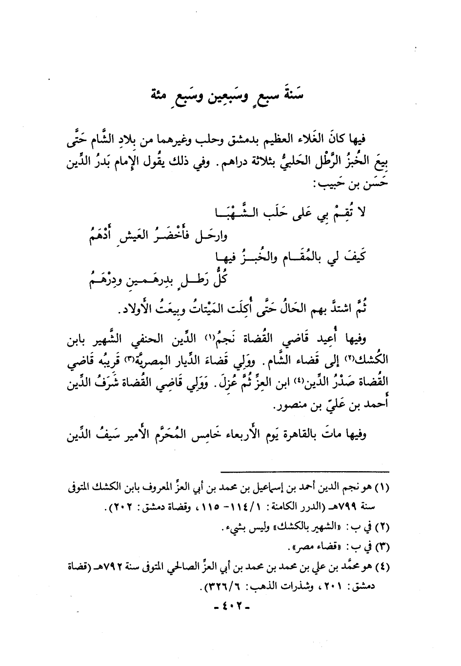(¬١) هو نجم الدين أحمد بن إسماعيل بن محمد بن أبي العزّ المعروف بابن الكشك المتوفى سنة ٧٩٩ هـ (الدرر الكامنة: ١/ ١١٤ - ١١٥، وقضاة دمشق: ٢٠٢).
