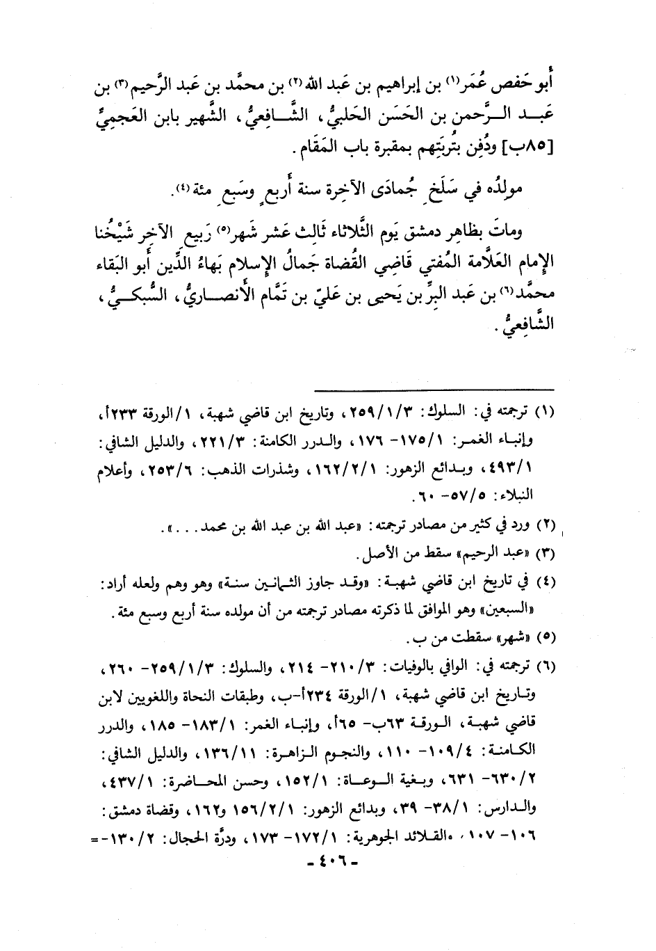 (¬٦) ترجمته في: الوافي بالوفيات: ٣/ ٢١٠ - ٢١٤، والسلوك: ٣/ ١/٢٥٩ - ٢٦٠، وتاريخ ابن قاضي شهبة، ١/الورقة ٢٣٤ أ-ب، وطبقات النحاة واللغويين لابن قاضي شهبة، الورقة ٦٣ ب-٦٥ أ، وإنباء الغمر: ١/ ١٨٣ - ١٨٥، والدرر الكامنة: ٤/ ١٠٩ - ١١٠، والنجوم الزاهرة: ١١/ ١٣٦، والدليل الشافي: ٢/ ٦٣٠ - ٦٣١، وبغية الوعاة: ١/ ١٥٢، وحسن المحاضرة: ١/ ٤٣٧، والدارس: ١/ ٣٨ - ٣٩، وبدائع الزهور: ١/ ٢/١٥٦ و ١٦٢، وقضاة دمشق: ١٠٦ - ١٠٧، والقلائد الجوهرية: ١/ ١٧٢ - ١٧٣، ودرّة الحجال: ٢/ ١٣٠ - -