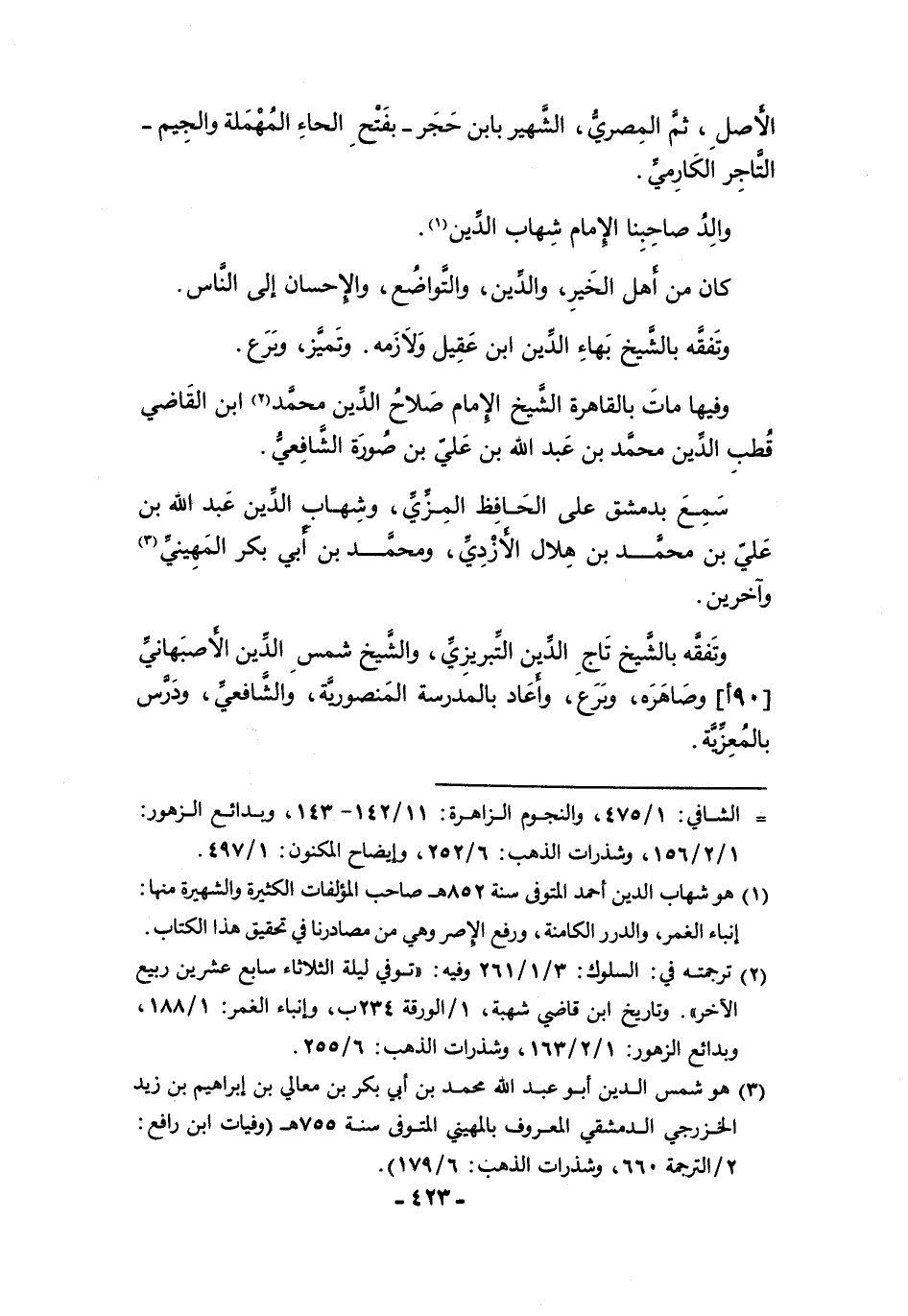 (¬١) هو شهاب الدين أحمد المتوفى سنة ٨٥٢ هـ صاحب المؤلفات الكثيرة والشهيرة منها: إنباء الغمر، والدرر الكامنة، ورفع الإصر وهي من مصادرنا في تحقيق هذا الكتاب.