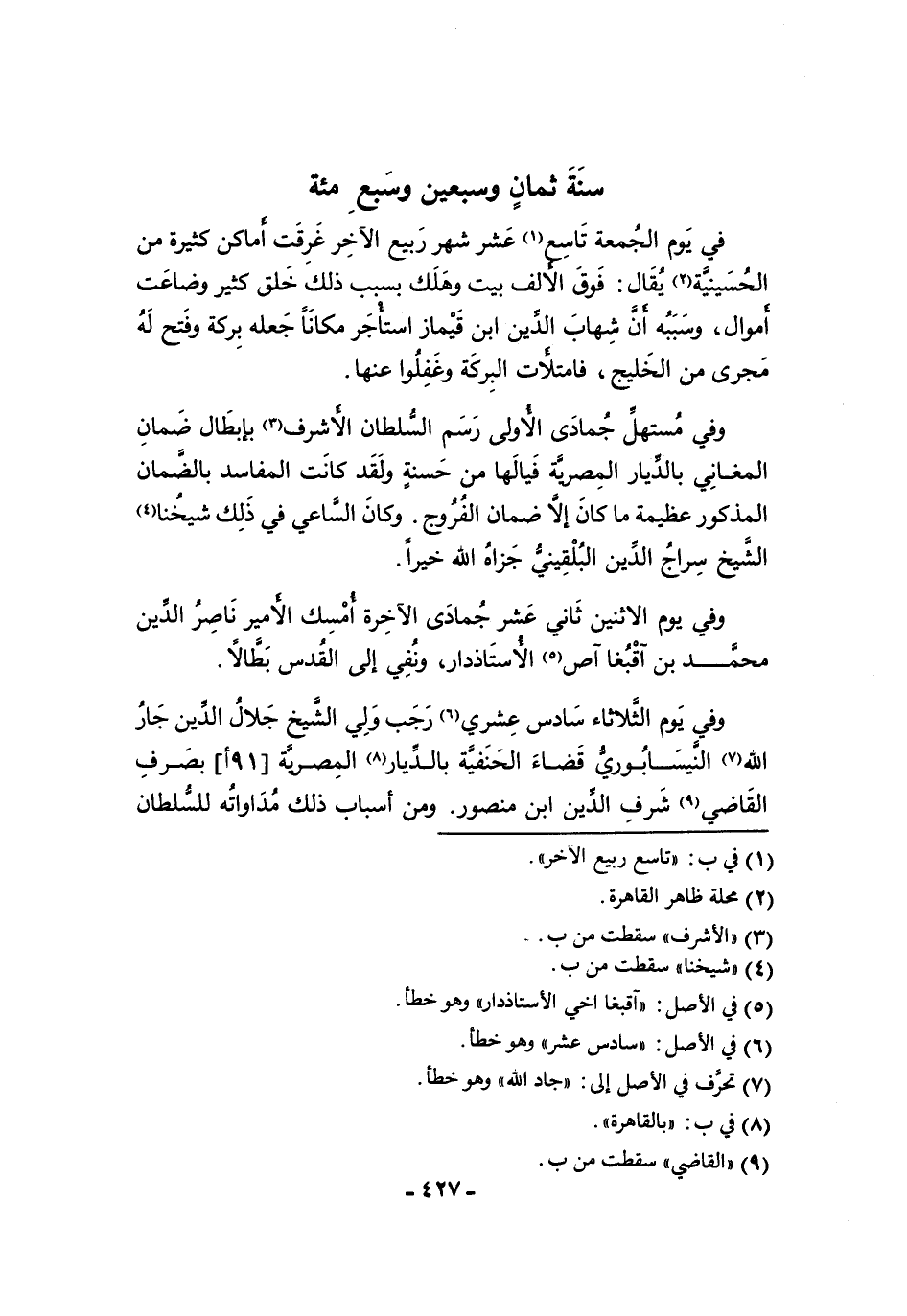 وفي مستهلّ جمادى الأولى رسم السّلطان الأشرف (¬٣) بإبطال ضمان المغاني بالدّيار المصريّة فيالها من حسنة ولقد كانت المفاسد بالضّمان المذكور عظيمة ما كان إلاّ ضمان الفروج. وكان السّاعي في ذلك شيخنا (¬٤) الشّيخ سراج الدّين البلقينيّ جزاه الله خيرا.
