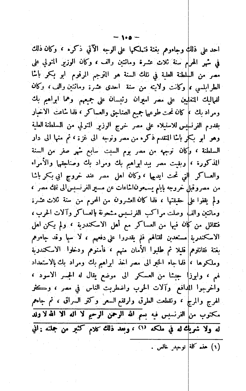 أحد على ذلك وجاءوهم بغتة فتملكها على الوجه الآتي ذكره، وكان ذلك في شهر المحرم سنة ثلاث عشرة ومائتين وألف، وكان الوزير المتولي على مصر من السلطنة العلية في تلك السنة هو المترجم المرقوم أبو بكر باشا الطرابلسي، وكانت ولايته من سنة إحدى عشرة ومائتين وألف، وكان للماليك المتغلبين على مصر أميران رئيسان على جميعهم وهما إبراهيم بك ومراد بك، كان تحت طوعهما جميع الصناجق والعساكر، فلما شاعت الأخبار بقدوم الفرنسيس للاستيلاء على مصر خرج الوزير المتولي من السلطنة العلية وهو أبو بكر باشا المتقدم ذكره من مصر وتوجه إلى غزة، ثم منها إلى دار السلطنة، وكان توجهه من مصر يوم السبت سابع شهر صفر من السنة المذكورة، وبقيت مصر بيد غبراهيم بك ومراد بك وصناجقهما والأمراء والعساكر التي تحت أيديهما، وكان أهل مصر عند خروج أبي بكر باشا من مصر وقبل خروجه بأيام يسمعون إشاعات عن مسير الفرنسيس إلى تملك مصر، ولم يقفوا على حقيقتها، فلما كان العشرون من المحرم من سنة ثلاث عشرة ومائتين وألف وصلت مراكب الفرنسيس مشحونة بالعساكر وآلات الحرب، فتقاتل من كان فيها من العساكر مع أهل الاسكندرية، ولم يكن أهل الاسكندرية مستعدين لقتالهم فلم يقدروا على دفعهم، لاسيما وقد جاءوهم بغتة فقاتلوهم قليلاً ثم طلبوا الأمان منهم، فأمنوهم ودخلوا الاسكندرية وملكوها، فلما جاء الخبر إلى مصر أخذ إبراهيم بك ومراد بك بالاستعداد لهم، وأبرزا جيشاً من العسكر إلى موضع يقال له الجسر الأسود، وأخرجوا المدافع وآلات الحرب واضطربت الناس في مصر، وكثر الهرج والمرج، وتقطعت الطرق وارتفع السعر وكثر السراق، ثم جاءهم مكتوب من الفرنسيس فيه بسم الله الرحمن الرحيم لا إله إلا الله لا ولد له ولا شريك له في ملكه، وبعد ذلك كلام كثير من جملته: إني