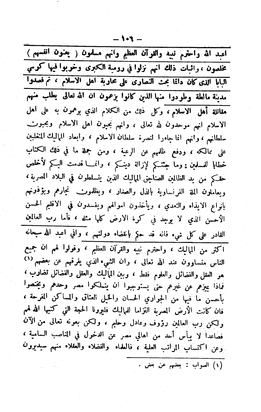 الذين يتسلطون في البلاد المصرية، ويعاملون الملة الفرنساوية بالذل والصغار، ويظلمون تجارهم ويؤذونهم بأنواع الإيذاء والتعدي، ويأخذون أموالهم ويفسدون في الإقليم الحسن الأحسن الذي لا يوجد في كرة الأرض كلها مثله، فأما رب العالمين القادر على كل شيء فإنه قد حكم بانقضاء دولتهم، وإني أعبد الله سبحانه أكثر من المماليك، واحترم نبيه والقرآن العظيم، وقولوا لهم إن جميع الناس متساوون عند الله تعالى، وإن الشيء الذي يفرقهم عن بعضهم هو العقل والفضائل والعلوم فقط، وبين المماليك والعقل والفضائل تضارب، فماذا يميزهم عن غيرهم حتى يستوجبوا أن يتملكوا مصر وحدهم ويختصوا بأحسن ما فيها من الجواري الحسان والخيل العتاق والمساكن المفرحة، ولكن رب العالمين رؤوف وعادل وحليم، ولكن بعونه تعالى من الآن فصاعداً لا ييأس أحد من أهالي مصر عن الدخول في المناصب السامية، وعن اكتساب المراتب العلية، فالعلماء والفضلاء والعقلاء منهم سيديرون الأمور، وبذلك يصلح حال الأمة كلها، وسابقاً كان في الأراضي المصرية المدن العظيمة والخلجان الواسعة والمتجر المتكاثر، وما أزال ذلك كله إلا الظلم والطمع من المماليك. يتسلطون في البلاد المصرية، ويعاملون الملة الفرنساوية بالذل والصغار، ويظلمون تجارهم ويؤذونهم بأنواع الإيذاء والتعدي، ويأخذون أموالهم ويفسدون في الإقليم الحسن الأحسن الذي لا يوجد في كرة الأرض كلها مثله، فأما رب العالمين القادر على كل شيء فإنه قد حكم بانقضاء دولتهم، وإني أعبد الله سبحانه أكثر من المماليك، واحترم نبيه والقرآن العظيم، وقولوا لهم إن جميع الناس متساوون عند الله تعالى، وإن الشيء الذي يفرقهم عن بعضهم هو العقل والفضائل والعلوم فقط، وبين المماليك والعقل والفضائل تضارب، فماذا يميزهم عن غيرهم حتى يستوجبوا أن يتملكوا مصر وحدهم ويختصوا بأحسن ما فيها من الجواري الحسان والخيل العتاق والمساكن المفرحة، ولكن رب العالمين رؤوف وعادل وحليم، ولكن بعونه تعالى من الآن فصاعداً لا ييأس أحد من أهالي مصر عن الدخول في المناصب السامية، وعن اكتساب المراتب العلية، فالعلماء والفضلاء والعقلاء منهم سيديرون