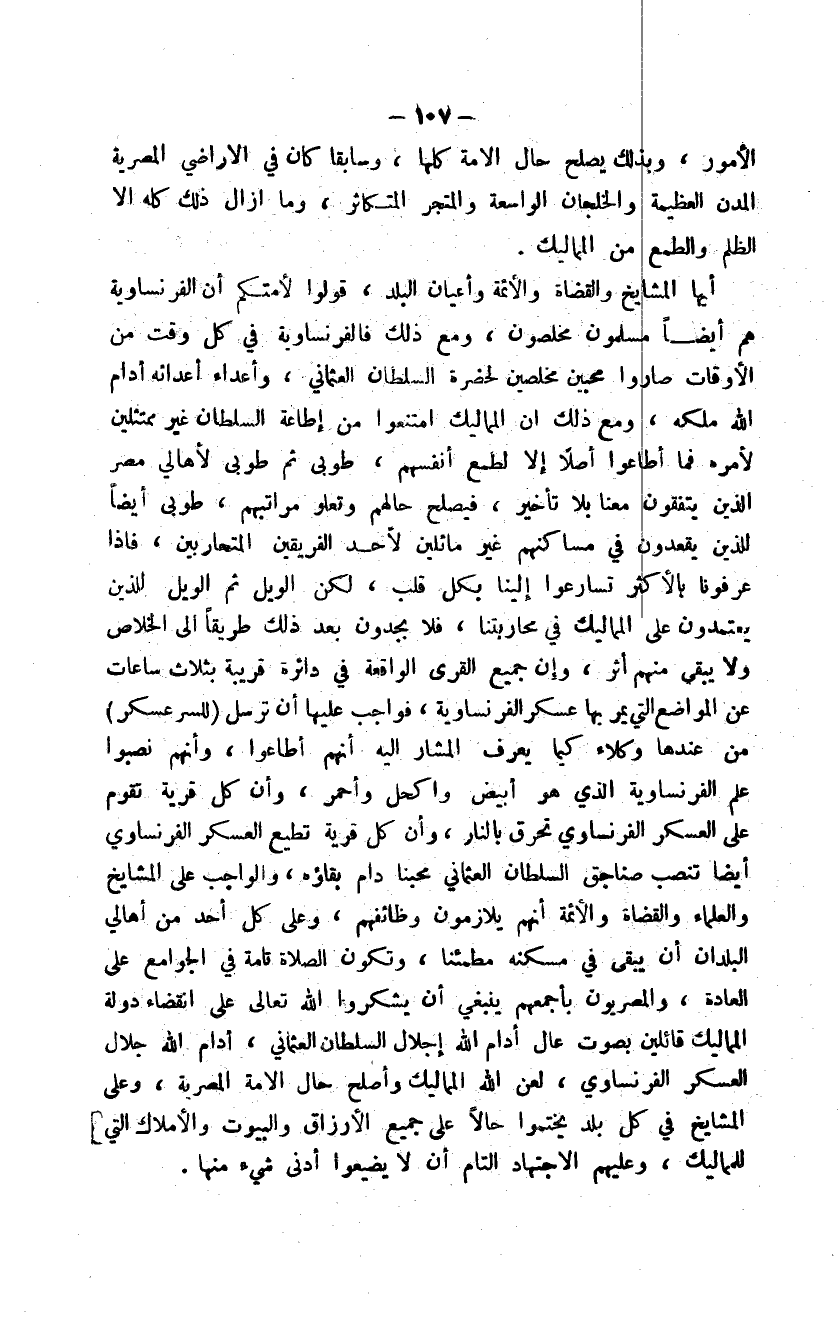 أيها المشايخ والقضاة والأئمة وأعيان البلد، قولوا لأمتكم أن الفرنساوية هم أيضاً مسلمون مخلصون، ومع ذلك فالفرنساوية في كل وقت من الأوقات صاروا محبين مخلصين لحضرة السلطان العثماني، وأعداء أعدائه أدام الله ملكه، ومع ذلك إن المماليك امتنعوا من إطاعة السلطان غير ممتثلين لأمره فما أطاعوا أصلاً إلا لطمع أنفسهم، طوبى ثم طوبى لأهالي مصر الذين يتفقون معنا بلا تأخير، فيصلح حالهم وتعلو مراتبهم، طوبى أيضاً للذين يقعدون في مساكنهم غير ماثلين لأحد الفريقين المتحاربين، فإذا عرفونا بالأكثر تسارعوا إلينا بكل قلب، لكن الويل ثم الويل للذين يعتمدون على المماليك في محاربتنا، فلا يجدون بعد ذلك طريقاً إلى الخلاص ولا يبقى منهم أثر، وإن جميع القرى الواقعة في دائرة قريبة بثلاث ساعات عن المواضع التي يمر بها عسكر الفرنساوية، فواجب عليها أن ترسل للسر عسكر من عندها وكلاء كيما يعرف المشار إليه أنهم أطاعوا، وأنهم نصبوا علم الفرنساوية الذي هو أبيض وأكحل وأحمر، وأن كل قرية تقوم على العسكر الفرنساوي تحرق بالنار، وأن كل قرية تطيع العسكر الفرنساوي أيضاً تنصب صناجق السلطان العثمان محبنا دام بقاؤه، والواجب على المشايخ والعلماء والقضاة والأئمة أنهم يلازمون وظائفهم، وعلى كل أحد من أهالي البلدان أن يبقى في مسكنه مطمئناً، وتكون الصلاة تامة في الجوامع على العادة، والمصريون بأجمعهم ينبغي أن يشكروا الله تعالى على انقضاء دولة المماليك قائلين بصوت عال أدام الله إجلال السلطان العثماني، أدام الله جلال العسكر الفرنساوي، لعن الله المماليك وأصلح حال الأمة المصرية، وعلى المشايخ في كل بلد يختموا حالاً على جميع الأرزاق والبيوت والأملاك التي للمماليك، وعليهم الاجتهاد التام أن لا يضيعوا أدنى شيء منها.