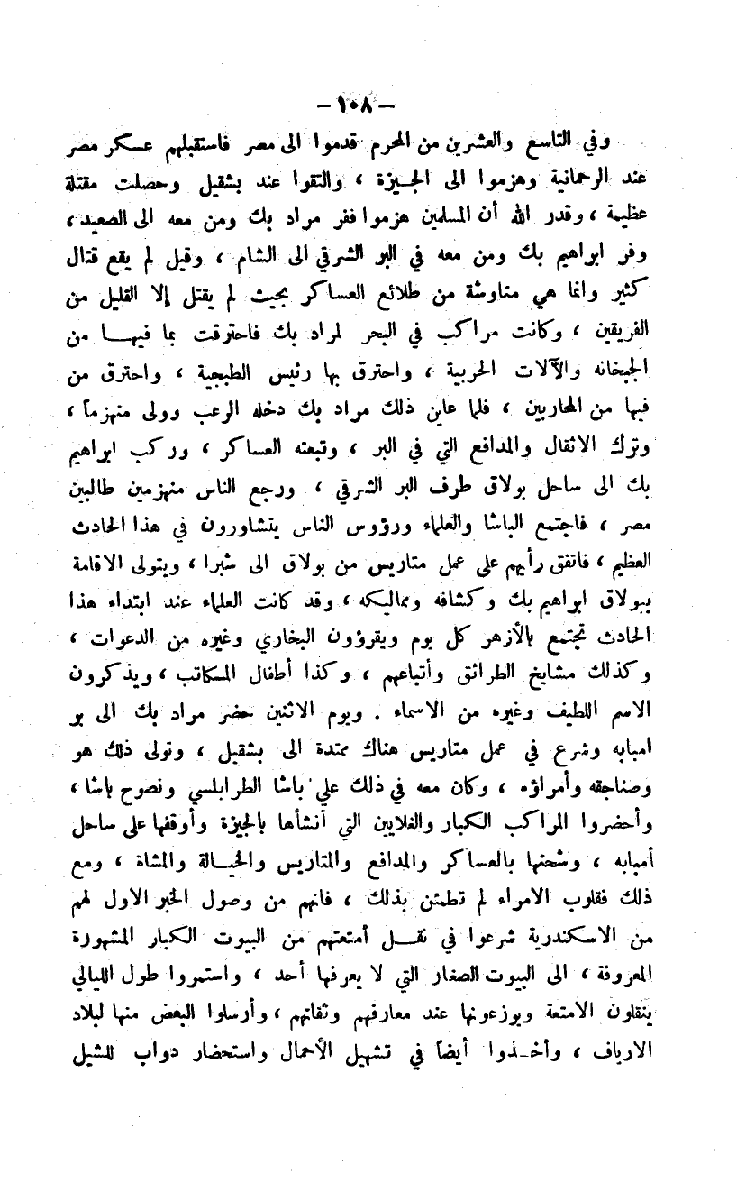 وفي التاسع والعشرين من المحرم قدموا إلى مصر فاستقبلهم عسكر مصر عند الرحمانية وهزموا إلى الجيزة، والتقوا عند بشقيل وحصلت مقتلة عظيمة، وقدر الله أن المسلمين هزموا ففر مراد بك ومن معه إلى الصعيد، وفر إبراهيم بك ومن معه في البر الشرقي إلى الشام، وقيل لم يقع قتال كثير وإنما هي مناوشة من طلائع العسكر بحيث لم يقتل إلا القليل من الفريقين، وكانت مراكب في البحر لمراد بك فاحترقت بما فيها من الجبخانه والآلات الحربية، واحترق بها رئيس الطبجية، واحترق من فيها من المحاربين، فلما عاين ذلك مراد بك دخله الرعب وولى منهزماً، وترك الأثقال والمدافع التي في البر، وتبعته العساكر، وركب إبراهيم بك إلى ساحل بولاق طرف البر الشرقي، ورجع الناس منهزمين طالبين مصر، فاجتمع الباشا والعلماء ورؤوس الناس يتشاورون في هذا الحادث العظيم، فاتفق رأيهم على عمل متاريس من بولاق إلى شبرا، ويتولى افقامة ببولاق إبراهيم بك وكشافه ومماليكه، وقد كانت العلماء عند ابتداء هذا الحادث تجتمع بالأزهر كل يوم ويقرؤون البخاي وغيره من الدعوات، وكذلك مشايخ الطرائق وأتباعهم، وكذا أطفال المكاتب، ويذكرون الاسم اللطيف وغيره من الأسماء. ويوم الاثنين حضر مراد بك إلى بر امبابه وشرع في عمل متاريس هناك ممتدة إلى بشقيل، وتولى ذلك هو وصناجقه وأمراؤه، وكان معه في ذلك علي باشا الطرابلسي ونصوح باشا، وأحضروا المراكب الكبار والغلايين التي أنشأها بالجيزة وأوقفها على ساحل أمبابه، وشحنها بالعساكر والمدافع والمتاريس والخيالة والمشاة، ومع ذلك فقلوب الأمراء لم تطمئن بذلك، فإنهم من وصول الخبر الأول لهمم من الاسكندرية شرعوا في نقل أمتعتهم من البيوت الكبار المشهورة المعروفة، إلى البيوت الصغار التي لا يعرفها أحد، واستمروا طول الليالي ينقلون الأمتعة ويوزعونها عند معارفهم وثقاتهم، وأرسلوا البعض منها لبلاد الأرياف، وأخذوا أيضاً في تشهيل الأحمال واستحضار دواب للشيل