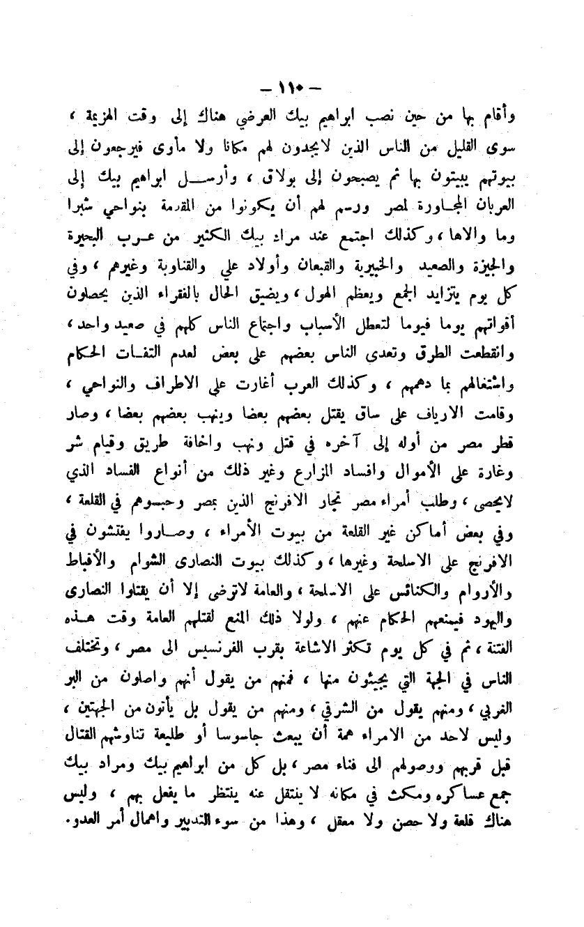 والقناوبة وغيرهم، وفي كل يوم يتزايد الجمع ويعظم الهول، ويضيق الحال بالفقراء الذين يحصلون أقواتهم يوماً فيوماً لتعطل الأسباب واجتماع الناس كلهم في صعيد واحد، وانقطعت الطرق وتعدى الناس بعضهم على بعض لعدم التفات الحكام واشتغالهم بما دهمهم، وكذلك العرب أغارت على الأطراف والنواحي، وقامت الأرياف على ساق يقتل بعضهم بعضاً وينهب بعضهم بعضاً، وصار قطر مصر من أوله إلى آخره في قتل ونهب وإخافة طريق وقيام شر وغارة على الأموال وإفساد المزارع وغير ذلك من أنواع الفساد الذي لا يحصى، وطلب أمراء مصر تجار الإفرنج الذين بمصر وحبوهم في القلعة، وفي بعض أماكن غير القلعة من بيوت الأمراء، وصاروا يفتشون في الإفرنج على الأسلحة وغيرها، وكذلك بيوت النصارى الشوام والأقباط والأروام والكنائس على الأسلحة، والعامة لا ترضى إلا أن يقتلوا النصارى واليهود فيمنعهم الحكام عنهم، ولولا ذلك المنع لقتلهم العامة وقت هذه الفتنة، ثم في كل يوم تكثر الإشاعة بقرب الفرنسيس إلى مصر، وتختلف الناس في الجهة التي يجيئون منها، فمنهم من يقول أنهم واصلون من البر الغربي، ومنهم من يقول من الشرقي، ومنهم من يقول بل يأتون من الجهتين، وليس لأحد من الأمراء همة أن يبعث جاسوساً أو طليعة تناوشهم القتال قبل قربهم ووصولهم إلى فناء مصر، بل كل من إبراهيم بيك ومراد بيك جمع عساكره ومكث في مكانه لا ينتقل عنه ينتظر ما يفعل بهم، وليس هناك قلعة ولا حصن ولا معقل، وهذا من سوء التدبير وإهمال أمر العدو. لقناوبة وغيرهم، وفي كل يوم يتزايد الجمع ويعظم الهول، ويضيق الحال بالفقراء الذين يحصلون أقواتهم يوماً فيوماً لتعطل الأسباب واجتماع الناس كلهم في صعيد واحد، وانقطعت الطرق وتعدى الناس بعضهم على بعض لعدم التفات الحكام واشتغالهم بما دهمهم، وكذلك العرب أغارت على الأطراف والنواحي، وقامت الأرياف على ساق يقتل بعضهم بعضاً وينهب بعضهم بعضاً، وصار قطر مصر من أوله إلى آخره في قتل ونهب وإخافة طريق وقيام شر وغارة على الأموال وإفساد المزارع وغير ذلك من أنواع الفساد الذي لا يحصى، وطلب أمراء مصر تجار الإفرنج الذين بمصر وحبوهم في القلعة، وفي بعض أماكن غير القلعة من بيوت الأمراء، وصاروا يفتشون في الإفرنج على الأسلحة وغيرها، وكذلك بيوت النصارى الشوام والأقباط والأروام والكنائس على الأسلحة، والعامة لا ترضى إلا أن يقتلوا النصارى واليهود فيمنعهم الحكام عنهم، ولولا ذلك المنع لقتلهم العامة وقت هذه الفتنة، ثم في كل يوم تكثر الإشاعة بقرب الفرنسيس إلى مصر، وتختلف الناس في الجهة التي يجيئون منها، فمنهم من يقول أنهم واصلون من البر الغربي، ومنهم من يقول من الشرقي، ومنهم من يقول بل يأتون من الجهتين، وليس لأحد من الأمراء همة أن يبعث جاسوساً أو طليعة تناوشهم القتال قبل قربهم ووصولهم إلى فناء مصر، بل كل من إبراهيم بيك ومراد بيك جمع عساكره ومكث في مكانه لا ينتقل عنه ينتظر ما يفعل بهم، وليس هناك قلعة ولا حصن ولا معقل، وهذا من سوء التدبير وإهمال أمر العدو.