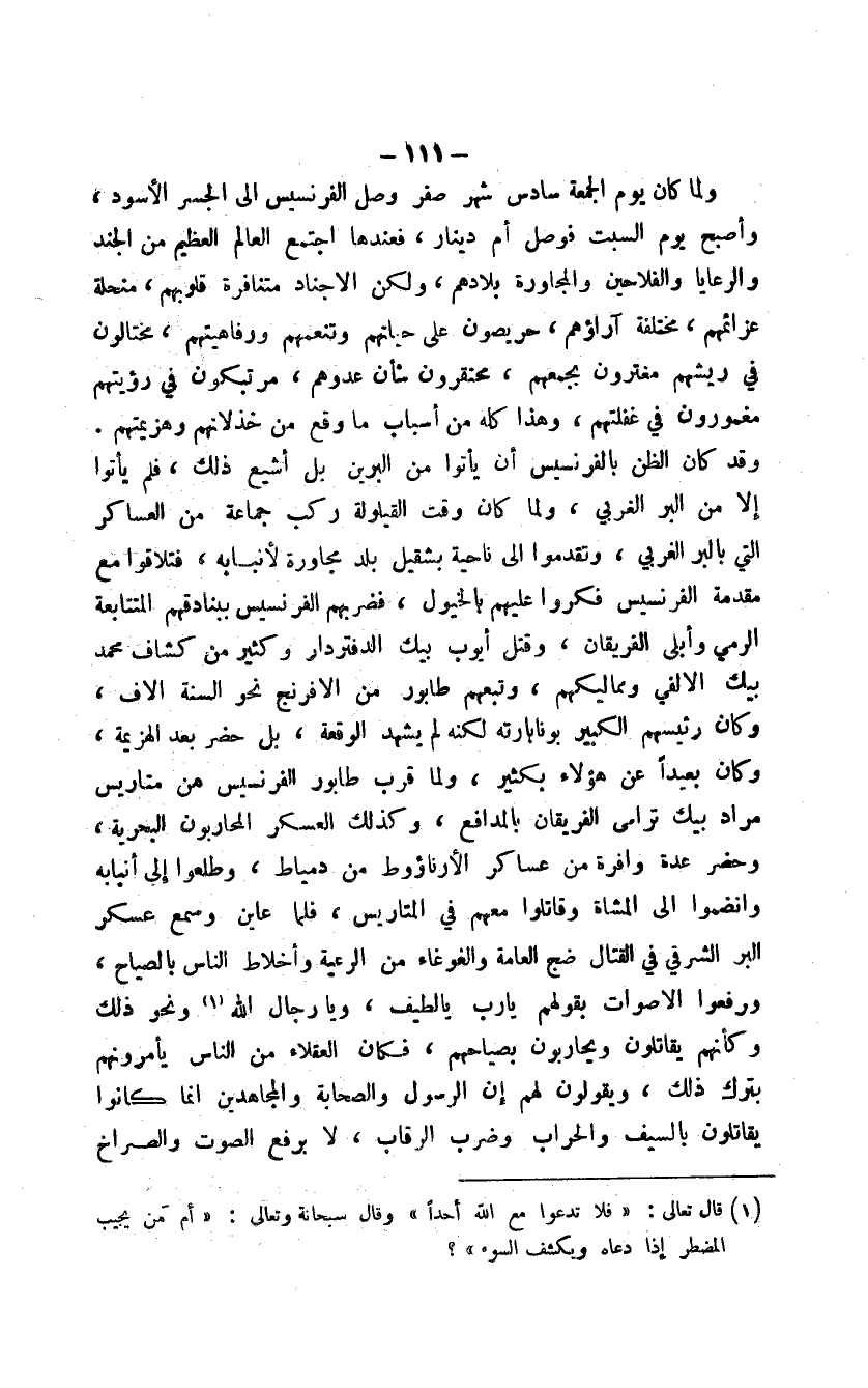 ولما كان يوم الجمعة سادس شهر صفر وصل الفرنسيس إلى الجسر الأسود، وأصبح يوم السبت فوصل أم دينار، فعندها اجتمع العالم العظيم من الجند والرعايا والفلاحين والمجاورة بلادهم، ولكن الأجناد متنافرة قلوبهم، منحلة عزائمهم، مختلفة آراؤهم، حريصون على حياتهم وتنعمهم ورفاهيتهم، مختالون في ريشهم مغترون بجمعهم، محتقرون شأن عدوهم، مرتبكون في رؤيتهم مغمورون في غفلتهم، وهذا كله من أسباب ما وقع من خذلانهم وهزيمتهم. وقد كان الظن بالفرنسيس أن يأتوا من البرين بل أشيع ذلك، فلم يأتوا إلا من البر الغربي، ولما كان وقت القيلولة ركب جماعة من العساكر التي بالبر الغربي، وتقدموا إلى ناحية بشقيل بلد مجاروة لأنبابه، فتلاقوا مع مقدمة الفرنسيس فكروا عليهم بالخيول، فضربهم الفرنسيس ببنادقهم المتتابعة الرمي وأبلى الفريقان، وقتل أيوب بيك الدفتر دار وكثير من كشاف محمد بيك الألفي ومماليكهم، تبعهم طابور من الإفرنج نحو الستة آلاف، وكان رئيسهم الكبير بونابارته لكنه لم يشهد الوقعة، بل حضر بعد الهزيمة، وكان بعيداً عن هؤلاء بكثير، ولما قرب طابور الفرنسيس من متاريس مراد بيك ترامى الفريقان بالمدافع، وكذلك العسكر المحاربون البحرية، وحضر عدة وافرة من عساكر الأرناؤوط من دمياط، وطلعوا إلى أنبابه وانضموا إلى المشاة وقاتلوا معهم في المتاريس، فلما عاين وسمع عسكر البر الشرقي في القتال ضج العامة والغوغاء من الرعية وأخلاط الناس بالصياح، ورفعوا الأصوات بقولهم يا رب يا لطيف، ويا رجال الله ونحو ذلك وكأنهم يقاتلون ويحاربون بصياحهم، فكان العقلاء من الناس يأمرونهم بترك ذلك، ويقولون لهم إن الرسول والصحابة والمجاهدين إنما كانوا يقاتلون بالسيف والحراب وضرب الرقاب، لا برفع الصوت والصراخ