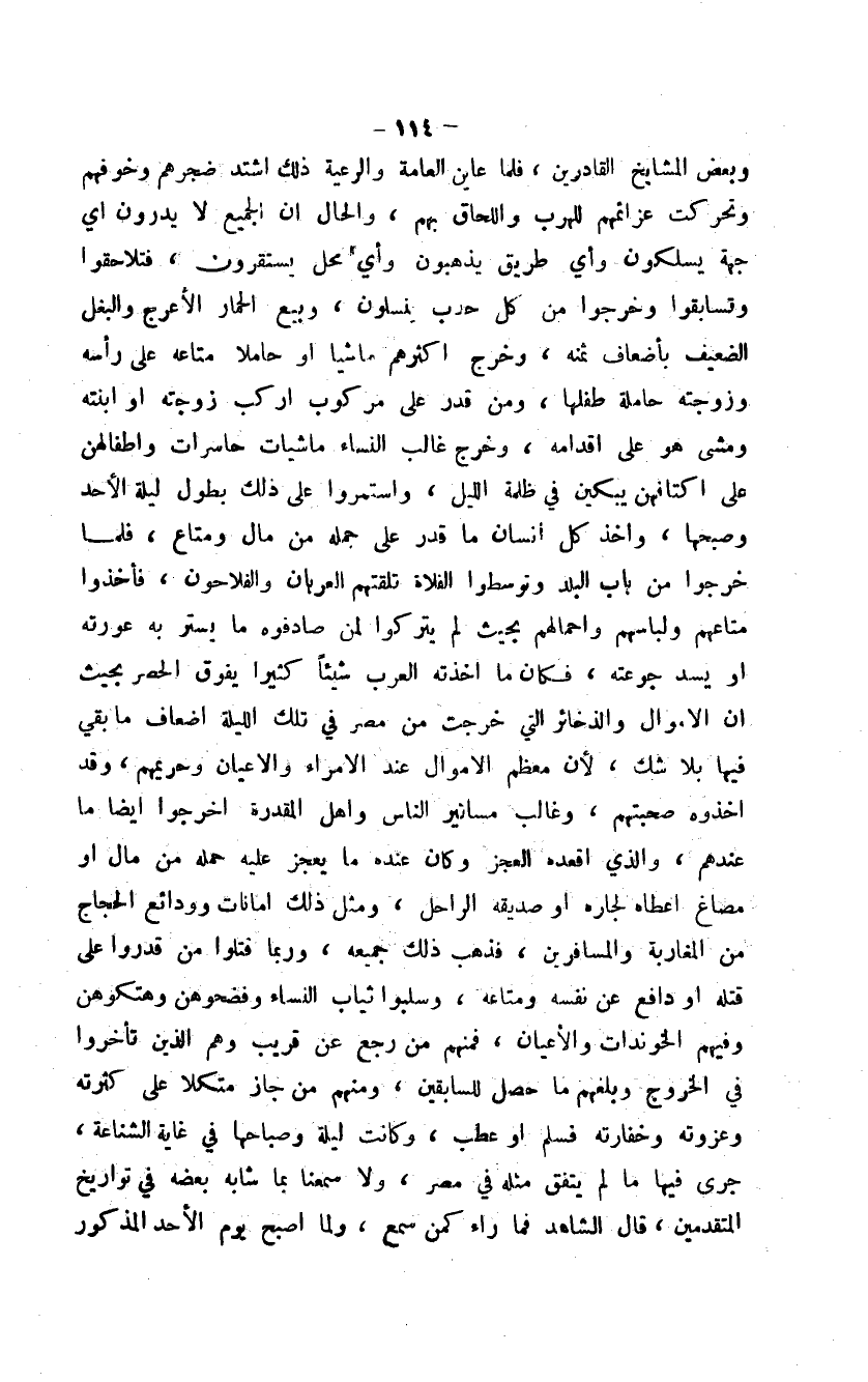 وبعض المشايخ القادرين، فلما عاين العامة والرعية ذلك اشتد ضجرهم وخوفهم وتحركت عزائمهم للهرب واللحاق بهم، والحال أن الجميع لا يدرون أي جهة يسلكون وأي طريق يذهبون وأي محل يستقرون، فتلاحقوا وتسابقوا وخرجوا من كل حدب ينسلون، وبيع الحمار الأعرج والبغل الضعيف بأضعاف ثمنه، وخرج أكثرهم ماشياً أو حاملاً متاعه على رأسه وزوجته حاملة طفلها، ومن قدر على مركوب أركب زوجته أو ابنته ومشى هو على أقدامه، وخرج غالب النساء ماشيات حاسرات وأطفالهن على أكتافهن يبكين في ظلمة الليل، واستمروا على ذلك بطول ليلة الأحد وصبحها، وأخذ كل إنسان ما قدر على حمله من مال ومتاع، فلما خرجوا من باب البلد وتوسطوا الفلاة تلقتهم العربان والفلاحون، فأخذوا متاعهم ولباسهم وأحمالهم بحيث لم يتكروا لمن صادفوه ما يستر به عورته أو يسد جوعته، فكان ما أخذته العرب شيئاً كثيراً يفوق الحصر بحيث أن الأموال والذخائر التي خرجت من مصر في تلك الليلة أضعاف ما بقي فيها بلا شك، لأن معظم الأموال عند الأمراء والأعيان وحريمهم، وقد أخذوه صحبتهم، وغالب مساتير الناس وأهل المقدرة أخرجوا أيضاً ما عندهم، والذي