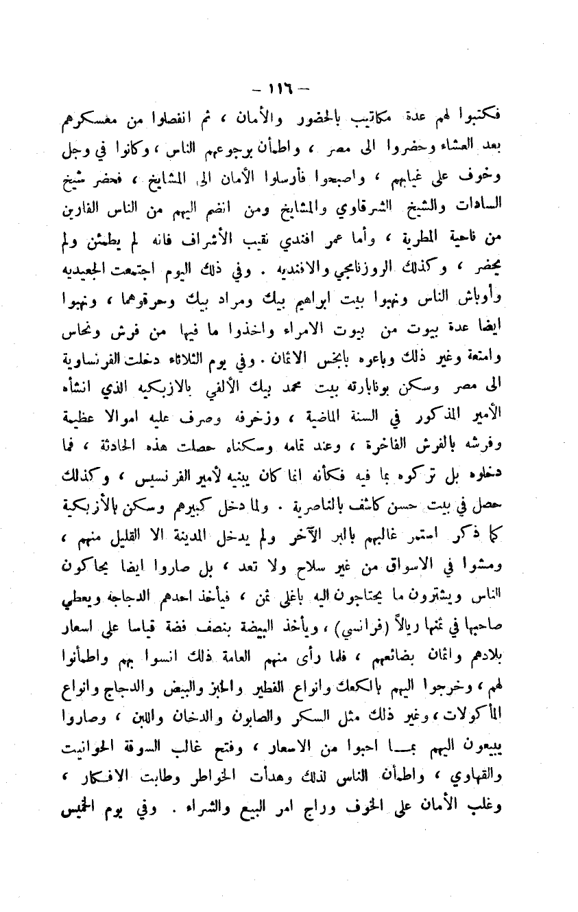 فكتبوا لهم عدة مكاتيب بالحضور والأمان، ثم انفصلوا من معسكرهم بعد العشاء وحضروا إلى مصر، واطمأن برجوعهم الناس، وكانوا في وجل وخوف على غيابهم، وأصبحوا فأرسلوا الأمان إلى المشايخ، فحضر شيخ السادات والشيخ الشرقاوي والمشايخ ومن انضم إليهم من الناس الفارين من ناحية المطرية، وأما عمر أفندي نقيب الأشراف فإنه لم يطمئن ولم يحضر، وكذلك الروزنامجي والأفندية. وفي ذلك اليوم اجتمعت الجعيدية وأوباش الناس ونهبوا بيت إبراهيم بيك ومراد بيك وحرقوهما، ونهبوا أيضاً عدة بيوت من بيوت الأمراء وأخذوا ما فيها من فرش ونحاس وأمتعة وغير ذلك وباعوه بأبخس الأثمان. وفي يوم الثلاثاء دخلت الفرنساوية إلى مصر وسكن بونابارتة بيت محمد بيك الألفي بالأزبكية الذي أنشأه الأمير المذكور في السنة الماضية، وزخرفه وصرف عليه أموالاً عظيمة وفرشه بالفرش الفاخرة، وعند تمامه وسكناه حصلت هذه الحادثة، فما دخلوه بل تركوه بما فيه فكأنه إنما كان يبنيه لأمير الفرنسيس، وكذلك حصل في بيت حسن كاشف بالناصرية. ولما دخل كبيرهم وسكن بالأزبكية كما ذكر استمر غالبهم بالبر الآخر ولم يدخل المدينة إلا القليل منهم، ومشوا في الأسواق من غير سلاح ولا تعد، بل صاروا أيضاً يحاكون الناس ويشترون ما يحتاجون إليه بأغلى ثمن، فيأخذ أحدهم الدجاجة ويعطي صاحبها في ثمنها ريالاً فرانسي، ويأخذ البيضة بنصف فضة قياساً على أسعار بلادهم وأثمان بضائعهم فلما رأى منهم العامة ذلك أنسوا بهم واطمأنوا لهم، وخرجوا إليهم بالكعك وأنواع الفطير والخبز والبيض والدجاج وأنواع المأكولات، وغير ذلك مثل السكر والصابون والدخان واللبن، وصاروا يبيعون إليهم بما أحبوا من الأسعار، وفتح غالب السوقة الحوانيت والقهاوي، واطمأن الناس لذلك وهدأت الخواطر وطابت الأفكار، وغلب الأمان على الخوف وراج أمر البيع والشراء. وفي يوم الخميس