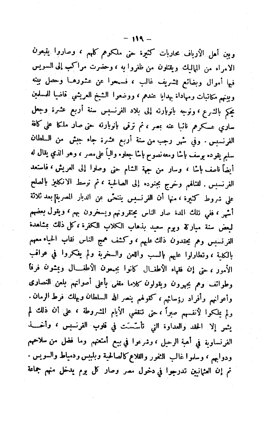 وبين أهل الأرياف محاربات كثية حتى ملكوهم كلهم، وصاروا يتبعون الأمراء من المماليك ويقتلون من ظفروا به، وحضرت مراكب إلى السويس فيها أموال وبضائع للشريف غالب، فمسحوا عن عشورها وحصل بينه وبينهم مكاتبات ومهاداة بهدايا عندهم، ووضعوا الشيخ العريشي قاضياً للمسلمين يحكم بالشرع، وتوجه بانوبارته إلى بلاد الفرنسيس سنة أربع عشرة وجعل ساري عسكرهم نائباً عنه بمصر، ثم ترقى بونابارته حتى صار ملكاً على كافة الفرنسيس. وفي شهر رجب من سنة أربع عشرة جاء جيش من السلطان سليم يقوده يوسف باشا ومعه نصوح باشا جعلوه والياً على مصر، وهو الذي يقال له أيضاً ناصف باشا، وسار من جهة الشام حتى وصلوا إلى العريش، فاستعد الفرنسيس لقتالهم وخرج بجنوده إلى الصالحية، ثم توسط الإنكليز بالصلح على شروط كثيرة، منها أن الفرنسيس يتنحى عن الديار المصرية بعد ثلاثة أشهر، ففي تلك المدة صار الناس يحتقرونهم يسخرون بهم، ويقول بعضهم لبعض سنة مباركة ويوم سعيد بذهاب الكلاب الكفرة، كل ذلك بمشاهدة الفرنسيس وهم يحقدون ذلك عليهم، وكشف همج الناس نقاب الحياء معهم بالكلية، وتطاولوا عليهم بالسب واللعن والسخرية ولم يفكروا في عواقب الأمور، حتى إن فقهاء الأطفال كانوا يجمعون الأطفال ويمشون فرقاً وطوائف وهم يجهرون ويقولون كلاماً مقفى بأعلى أصواتهم يلعن النصارى وأعوانهم وأفراد رؤسائهم، كقولهم ينصر الله السلطان ويهلك فرط الرمان. ولم يملكوا لأنفسهم صبراً، حتى تنقضي الأيام المشروطة، على أن ذلك لم يثمر إلا الحقد والعداوة التي تأسست في قلوب الفرنسيس، وأخذ الفرنساوية في أهبة الرحيل، وشرعوا في بيع أمتعتهم وما فضل من سلاحهم ودوابهم، وسلموا غالب الثغور والقلاع كالصالحية وبلبيس ودمياط والسويس. ثم إن العثمانيين تدرجوا في دخول مصر وصار كل يوم يدخل منهم جماعة