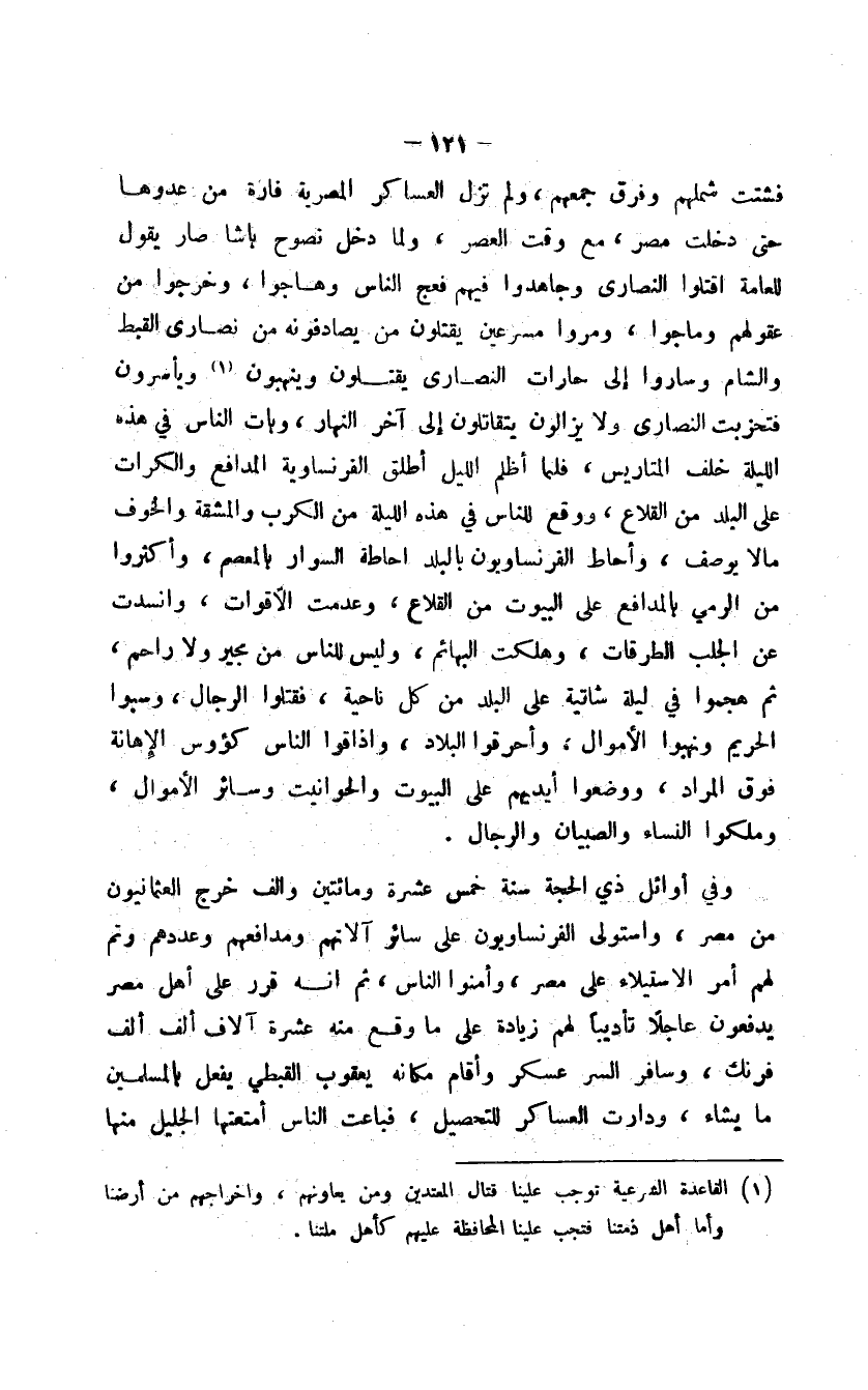 فشتت شملهم وفرق جمعهم، ولم تزل العساكر المصرية فارة من عدوها حتى دخلت مصر، مع وقت العصر، ولما دخل نصوح باشا صار يقول للعامة اقتلوا النصارى وجاهدوا فيهم فعج الناس وهاجوا، وخرجوا من عقولهم وماجوا، ومروا مسرعين يقتلون من يصادفونه من نصارى القبط والشام وساروا إلى حارات النصارى يقتلون وينهبون ويأسرون فتحزبت النصارى ولا يزالون يتقاتلون إلى آخر النهار، وبات الناس في هذه الليلة خلف المتاريس، فلما أظلم الليل أطلق الفرنساوية المدافع والكرات على البلد من القلاع، ووقع الناس في هذه الليلة من الكرب والمشقة والخوف ما لا يوصف، وأحاط الفرنساويون بالبلد إحاطة السوار بالمعصم، وأكثروا من الرمي بالمدافع على البيوت من القلاع، وعدمت الأقوات، وانسدت عن الجلب الطرقات، وهلكت البهائم، وليس للناس من مجير ولا راحم، ثم هجموا في ليلة شاتية على البلد من كل ناحية، فقتلوا الرجال، وسبوا الحريم ونهبوا الأموال، وأحرقوا البلاد، وأذاقوا الناس كؤوس الإهانة فوق المراد، ووضعوا أيديهم على البيوت والحوانيت وسائر الأموال، وملكوا النساء والصبيان والرجال.