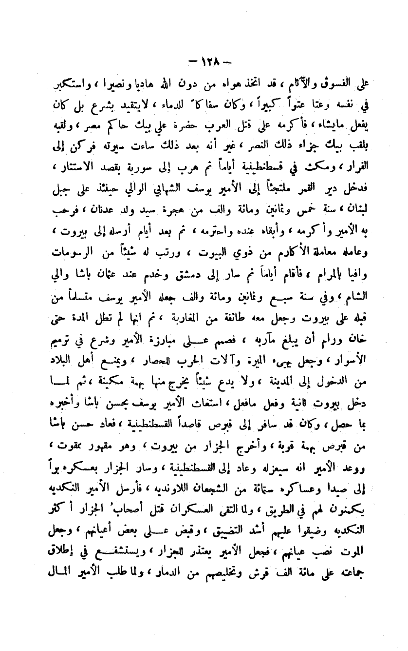 على الفسوق والآثام، قد اتخذ هواه من دون الله هادياً ونصيرا، واستكبر في نفسه وعتا عتواً كبيراً، وكان سفاكاً للدماء، لا يتقيد بشرع بل كان يفعل ما يشاء، فأكرمه على قتل العرب حضرة علي بيك حاكم مصر، ولقبه بلقب بيك جزاء ذلك النصر، غير أنه بعد ذلك ساءت سيرته فركن إلى الفرار، ومكث في قسطنطينية أياماً ثم هرب إلى سورية بقصد الاستتار، فدخل دير القمر ملتجئاً إلى الأمير يوسف الشهابي الوالي حينئذ على جبل لبنان، سنة خمس وثمانين ومائة وألف من هجرة سيد ولد عدنان، فرحب به الأمير وأكرمه، وأبقاه عنده واحترمه، ثم بعد أيام أرسله إلى بيروت، وعامله معاملة الأكارم من ذوي البيوت، ورتب له شيئاً من الرسومات وافياً بالمرام، فأقام اياماً ثم سار إلى دمشق وخدم عند عثمان باشا والي الشام، وفي سنة سبع وثمانين ومائة وألف جعله الأمير يوسف متسلماً من قبله على بيروت وجعل معه طائفة من المغاربة، ثم إنها لم تطل المدة حتى خان ورام أن يبلغ مآربه، فصمم على مبارزة الأمير وشرع في ترميم الأسوار، وجعل يهيىء الميرة وآلات الحرب للحصار، ويمنع أهل البلاد من الدخول إلى المدينة، ولا يدع شيئاً يخرج منها بهمة مكينة، ثم لما دخل بيروت ثانية وفعل ما فعل، استغاث الأمير يوسف بحسن باشا وأخبره بما حصل، وكان قد سافر إلى قبرص قاصداً القسطنطينية، فعاد حسن باشا من قبرص بهمة قوية، وأخرج الجزار من بيروت، وهو مقهور ممقوت، ووعد الأمير أنه سيعزله وعاد إلى القسطنطينية، وسار الجزار بعسكره براً إلى صيدا وعساكره ستمائة من الشجعان اللاوندية، فأرسل الأمير النكدية يكمنون لهم في الطريق، ولما التقى العسكران قتل أصحاب الجزار أكثر النكدية وضيقوا عليهم أشد التضييق، وقبض على بعض أعيانهم، وجعل الموت نصب عيانهم، فجعل الأمير يعتذر للجزار، ويستشفع في إطلاق جماعته على مائة ألف قرش وتخليصهم من الدمار، ولما طلب الأمير المال