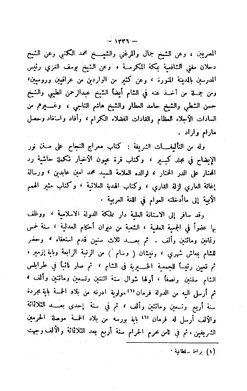 وقد سافر إلى الأستانة العلية دار مملكة الدولة الإسلامية، ووظف بها عضواً في الجمعية العلمية، الشعبة من ديوان أحكام العدلية، سنة خمس وثمانين ومائتين وألف. ثم بعد ثلاث سنين قدم استعفاء، وحضر للشام بمعاش شهري، ونيشان وسام من الرتبة الرابعة وباية إزمير، ثم تعين رئيساً للجمعية الخيرية في الشام، ثم صار نائباً في طرابلس الشام سنتين ونصفاً، أولها شوال سنة اثنتين وتسعين ومائتين وألف، ثم أرسل إليه من الدولة فرمان مولوية ادرنه من بلاد الخمسة باية مجردة سنة أربع وتسعين ومائتين وألف، ثم في سنة إحدى بعد الثلاثمائة والألف أرسل له فرمان باية بورسه من بلاد الخمسة موصلة الحرمين الشريفين. ثم في ثامن محرم الحرام سنة أربع بعد الثلاثمائة والألف وجهت