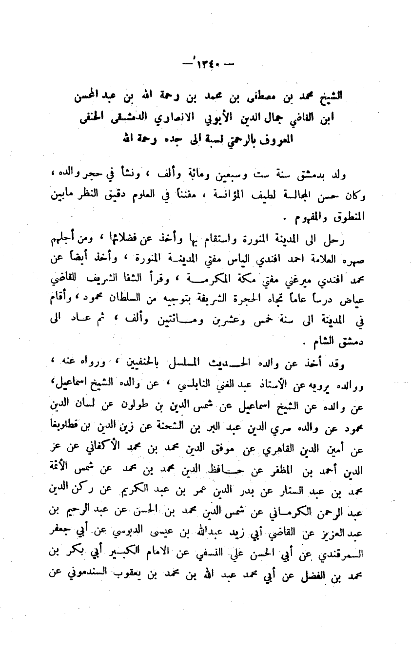 الشيخ محمد بن مصطفى بن محمد بن رحمة الله بن عبد المحسن بن القاضي جمال الدين الأيوبي الأنصاري الدمشقي الحنفي المعروف بالرحمتي نسبة إلى جده رحمة الله.