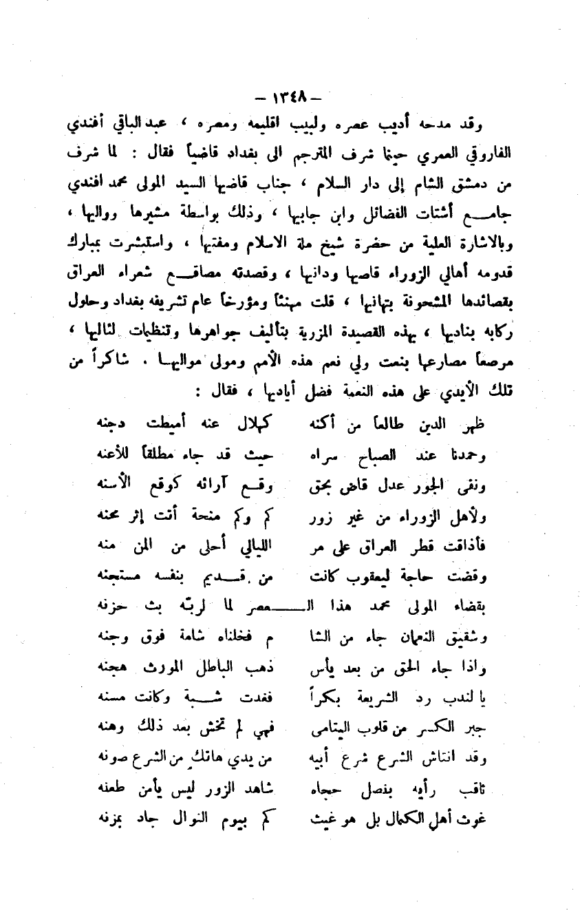 وقد مدحه أديب عصره ولبيب إقليمه ومصره، عبد الباقي أفندي الفاروقي العمري حينما شرف المترجم إلى بغداد قاضياً فقال: لما شرف من دمشق الشام إلى دار السلام، جناب قاضيها السيد المولى محمد أفندي جامع أشتات الفضائل وابن جابيها، وذلك بواسطة مشيرها وواليها، وبالإشارة العلية من حضرة شيخ ملة الإسلام ومفتيها، واستبشرت بمبارك قدومه أهالي الزوراء قاصيها ودانيها، وقصدته مصاقع شعراء العراق بقصائدها المشحونة بتهانيها، قلت مهنئاً ومؤرخاً عام تشريفه بغداد وحلول ركابه بناديها، بهذه القصيدة المزرية بتأليف جواهرها وتنظيمات لئاليها، مرصعاً مصارعها بنعت ولي نعم هذه الأمم ومولى مواليها. شاكراً من تلك الأيدي على هذه النعمة فضل أياديها، فقال: