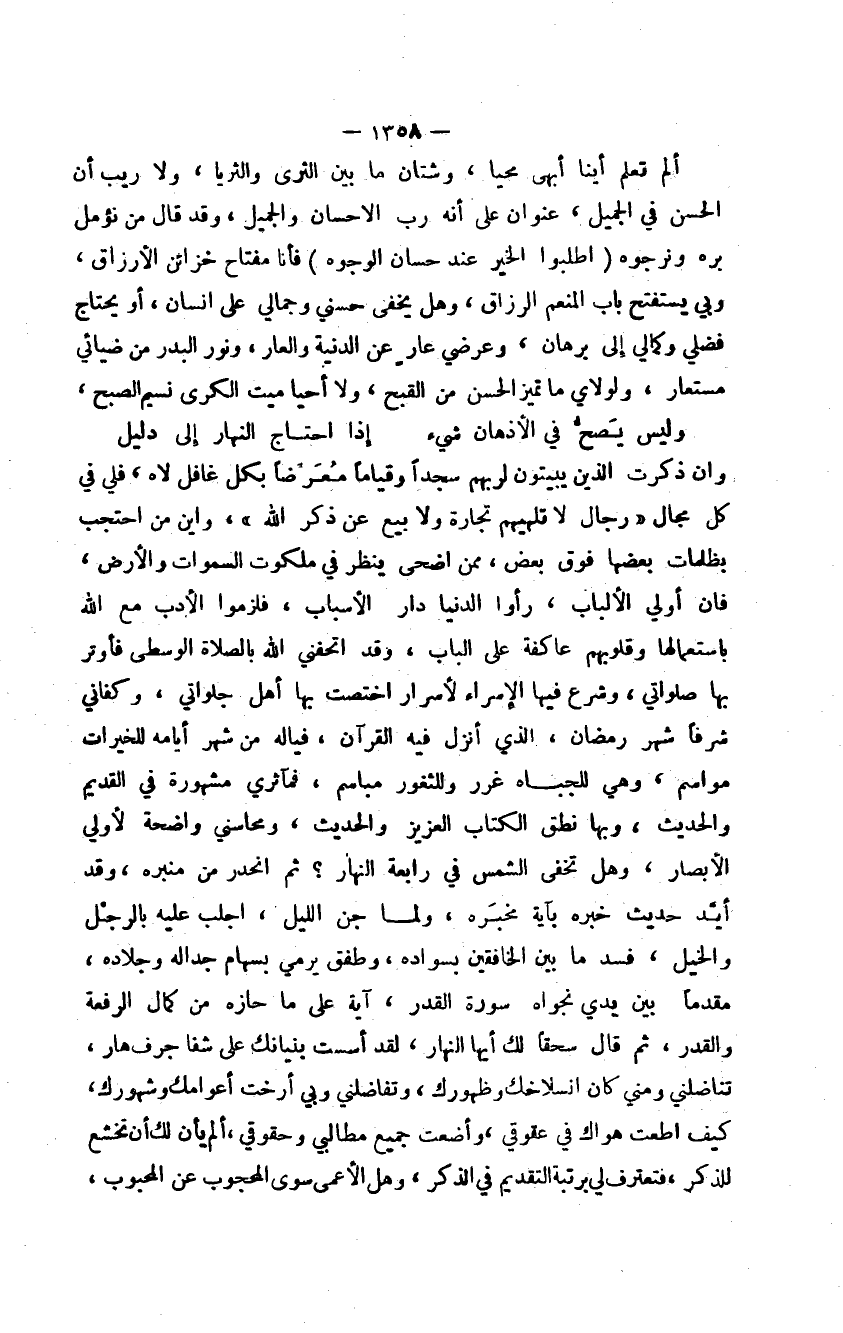 وإن ذكرت الذين يبيتون لربهم سجداً وقياماً معرضاً بكل غافل لاه، فلي في كل مجال، " رجال لا تلهيهم تجارة ولا بيع عن ذكر الله "، وأين من احتجب بظلمات بعضها فوق بعض، ممن أضحى ينظر في ملكوت السموات والأرض، فإن أولي الألباب، رأوا الدنيا دار الأسباب، فلزموا الأدب مع الله باستعمالها وقلوبهم عاكفة على الباب، وقد أتحفني بالصلاة الوسطى فأوتر بها صلواتي، وشرع فيها الإسراء لأسرار اختصت بها أهل جلواتي، وكفاني شرفاً شهر رمضان، الذي أنزل فيه القرآن، فيا له من شهر أيامه للخيرات مواسم، وهي للجباه غرر وللثغور مباسم، فمآثري مشهورة في القديم والحديث، وبها نطق الكتاب العزيز والحديث، ومحاسني واضحة لأولي الأبصار، وهل تخفى الشمس في رابعة النهار؟ ثم انحدر من منبره، وقد أيد حديث خبره بآية مخبره، ولما جن الليل، اجلب عليه بالرجل والخيل، فسد ما بين الخافقين بسواده، وطفق يرمي بسهام جداله وجلاده، مقدماً بين يدي نجواه سورة القدر، آية على ما حازه من كمال الرفعة والقدر، ثم قال سحقاً لك أيها النهار، لقد أسست بنيانك على شفا جرف هار، تناضلني ومني كان انسلاخك وظهورك، وتفاضلني وبي أرخت أعوامك وشهورك، كيف أطعت هواك في عقوقي، وأضعت جميع مطالبي وحقوقي، ألم يأن لك أن تخشع للذكر، فتعترف لي برتبة التقديم في الذكر، وهل الأعمى سوى المحجوب عن المحبوب،