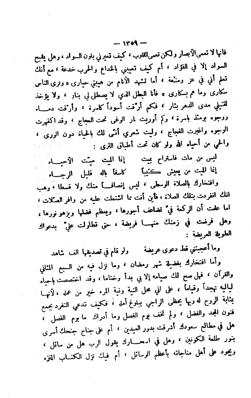 وأما افتخارك بفضيلة شهر رمضان، وما نزل فيه من السبع المثاني والقرآن، فهل صح لك صيامه إلا بي بدأ وختاماً، وقد اختصصت بإحياء لياليه تهجداً وقياماً، على أني محل النية ونية المرء خير من عمله، لأنها بمثابة الروح له وبها يحظى الراجي ببلوغ أمله، فكيف تدعي التفرد بجمع فنون المجد والفضل. ولم تخف يوم الفصل وما أدراك ما يوم الفصل، هل في مطالع سعودك أشرقت بدور العيدين، أم على جناح جنحك أسرى بنور طلعة الكونين، وهل في أسحارك يقول الرب هل من سائل، ويجود على أهل مناجاته بأعظم الوسائل، أم فيك نزل الكتاب المنزه
