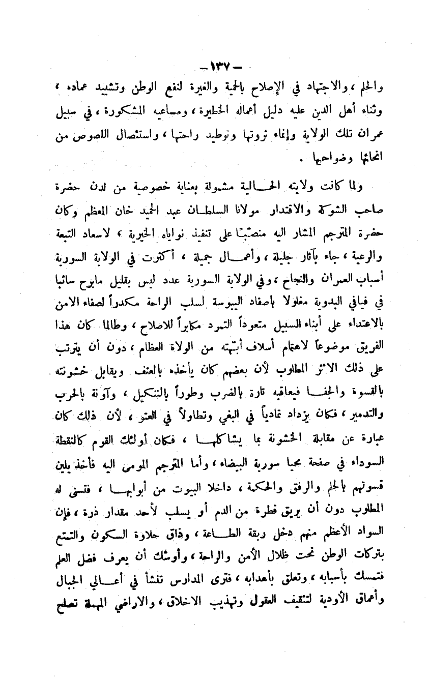 ولما كانت ولايته الحالية مشمولة بعناية خصوصية من لدن حضرة صاحب الشوكة والاقتدار مولانا السلطان عبد الحميد خان المعظم وكان حضرة المترجم المشار إليه منصباً على تنفيذ نواياه الخيرية، لإسعاد التبعة والرعية، جاء بآثار جليلة، وأعمال جميلة، أكثرت في الولاية السورية أسباب العمران والنجاح، وفي الولاية السورية عدد ليس بقليل ما برح سائباً في فيافي البدوية مغلولاً بأصفاد اليبوسة لسلب الراحة مكدراً لصفاء الأمن بالاعتداء على أبناء السبيل متعوداً التمرد مكابراً للإصلاح، وطالما كان هذا الفريق موضوعاً لاهتمام أسلاف أبهته من الولاة العظام، دون أن يترتب على ذلك الأثر المطلوب لأن بعضهم كان يأخذه بالعنف ويقابل خشونته بالقسوة والجفا فيعاقبه تارة بالضرب وطوراً بالتنكيل، وآونة بالحرب والتدمير، فكان يزداد تمادياً في البغي وتطاولاً في العتو، لأن ذلك كان عبارة عن مقابلة الخشونة بما يشاكلها، فكان أولئك القوم كالنقطة السوداء في صفحة محيا سورية البيضاء، وأما المترجم المومى إليه فأخذ يلين قسوتهم بالحلم والرفق والحكمة، داخلاً البيوت من أبوابها، فتسنى له المطلوب دون أن يريق قطرة من الدم أو يسلب لأحد مقدار ذرة، فإن السواد الأعظم منهم دخل ربقة الطاعة، وذاق حلاوة السكون والتمتع بتركات الوطن تحت ظلال الأمن والراحة، وأوشك أن يعرف فضل العلم فتمسك بأسبابه، وتعلق بأهدابه، فترى المدارس تنشأ في أعالي الجبال وأعماق الأودية لتثقيف العقول وتهذيب الأخلاق، والأراضي المهملة تصلح