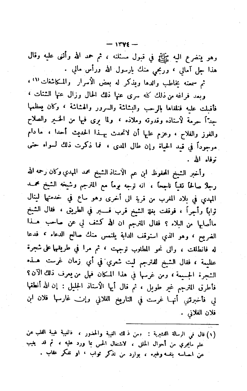 وأخبر الشيخ المحفوظ ابن عم الأستاذ الشيخ محمد المهدي وكان رحمه الله تعالى رجلاً صالحاً تقياً ناجحاً، إنه توجه يوماً مع المترجم وشيخه الشيخ محمد المهدي في بلاد المغرب من قرية إلى أخرى وهو ساع في خدمتهما لينال ثواباً وأجراً، فوقفت بغلة الشيخ قرب قبر في الطريق، فقال الشيخ ما أصابها من البلاء؟ فقال المترجم إن الله كشف لي عن صاحب هذا الضريح، وهو الذي استوقف الدابة يلتمس منك صالح الدعاء، فدعا له فانطلقت، وإلى نحو المطلوب توجهت، ثم مرا في طريقهما على شجرة عظيمة، فقال الشيخ للمترجم ليت شعري في أي زمان غرست هذه الشجرة الجسيمة، ومن غرسها في هذا المكان فهل من يعرف ذلك الآن؟ فأطرق المترجم غير طويل، ثم قال أيها الأستاذ الجليل: إن الله أنطقها لي فأخبرتني أنها غرست في التاريخ الفلاني وإن غارسها فلان ابن فلان الفلاني.