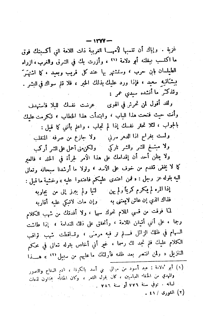 لما فوقت من قسي الملام نحوك سهماً، ولا أفدتك من شهب الكلام رجما، على أنني أتيقن الملامة، وأتحقق على ذلك الندامة، إذا طاشت السهام في ظلك الزائل فلم تر فيه مرمى، وتساقطت شهب ثواقب الكلام عليك فلم تجد لك رسما، غير أني أخلص بقوله تعالى في محكم التنزيل " ولمن انتصر بعد ظلمه فأولئك ما عليهم من سبيل " هذا