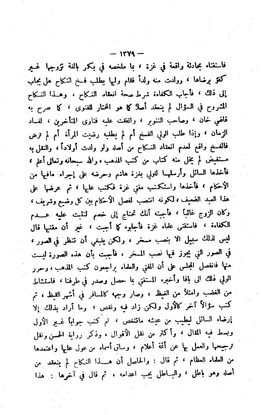 فاستفتاه بحادثة واقعة في غزة، بما ملخصه في بكر بالغة تزوجها غير كفؤ برضاها، وولدت منه ولداً فقام وليها يطلب فسخ النكاح هل يجاب إلى ذلك، فأجاب الكفاءة شرط صحة انعقاد النكاح، وهذا النكاح المشروح في السؤال لم ينعقد أصلاً كما هو المختار للفتوى، كما صرح به قاضي خان، وصاحب التنوير، واتفقت عليه فتاوى المتأخرين، لفساد الزمان، وإذا طلب الولي الفسخ أم لم يطلبه رضيت المرأة أم لم ترض فالفسخ واقع لعدم انعقاد النكاح من أصله ولو ولدت أولاداً، والنقل به مستفيض لم يخل منه كتاب من كتب المذهب، والله سبحانه وتعالى أعلم، فأخذها السائل وأرسلها للولي بغزة هاشم وحرضه على إجراء ما فيها من الأحكام، فأخذها واستكتب مفتي غزة فكتب عليها، ثم عرضها على هذا العبد الضعيف، لكونه انتصب لفصل الأحكام بين كل وضيع وشريف، وكان الزوج غائباً، فأجبته أنك تحتاج إلى خصم لتثبت عليه عدم الكفاءة، فاستفتى علماء غزة فأجابوه كما أجبت، غير أن مفتيها قال ليس لذلك سبيل إلا بنصب مسخر، ولكن ينبغي أن تنظر في الصور، في الصور التي يجوز فيها نصب المسخر، فأجبت بأن هذه الصورة ليست منها فانفصل المجلس على أن المفتي والعلماء يراجعون كتب المذهب، وحرر الولي ذلك إلى يافا وأخبره المستفتي بما حصل وصدر في طرفنا، فاستشاط من الغضب وامتلأ من الغيظ، وصار وجهه كالمسافر في أشهر القيظ، ثم كتب سؤالاً آخر كالأول ولكن زاد فيه ونقص، وما أراد بذلك إلا إرضاء السائل ليطيب من عيشه ما تنغص، تم كتب جواباً غير الأول وبسط فيه المقال، وأكثر من نقل الأقوال، وذكر رواية الحسن ونقل ترجيحها والعمل بها عن أئمة أعلام، وساق أسماء من عول عليها واعتمدها من العلماء العظام، ثم قال: والحاصل أن هذا النكاح لم ينعقد من أصله وهو باطل، والباطل يجب إعدامه، ثم قال في آخرها: هذا