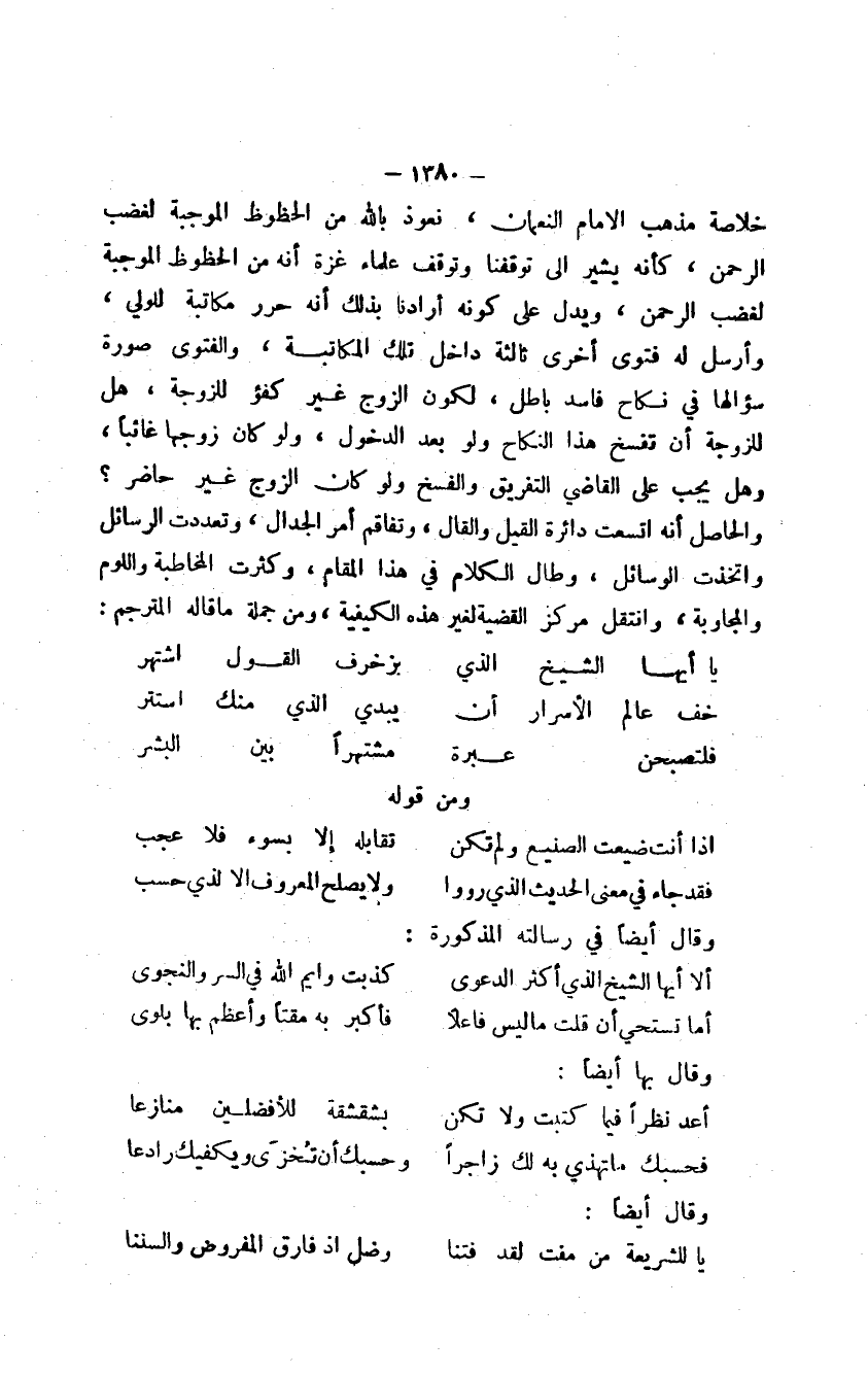 خلاصة مذهب الإمام النعمان، نعوذ بالله من الحظوظ الموجبة لغضب الرحمن، كأنه يشير إلى توقفنا وتوقف علماء غزة أنه من الحظوظ الموجبة لغضب الرحمن، ويدل على كونه أرادنا بذلك أنه حرر مكاتبة للولي، وأرسل له فتوى أخرى ثالثة داخل تلك المكاتبة، والفتوى صورة سؤالها في نكاح فاسد باطل، لكون الزوج غير كفؤ للزوجة، هل للزوجة أن تفسخ هذا النكاح ولو بعد الدخول، ولو كان زوجها غائباً، وهل يجب على القاضي التفريق والفسخ ولو