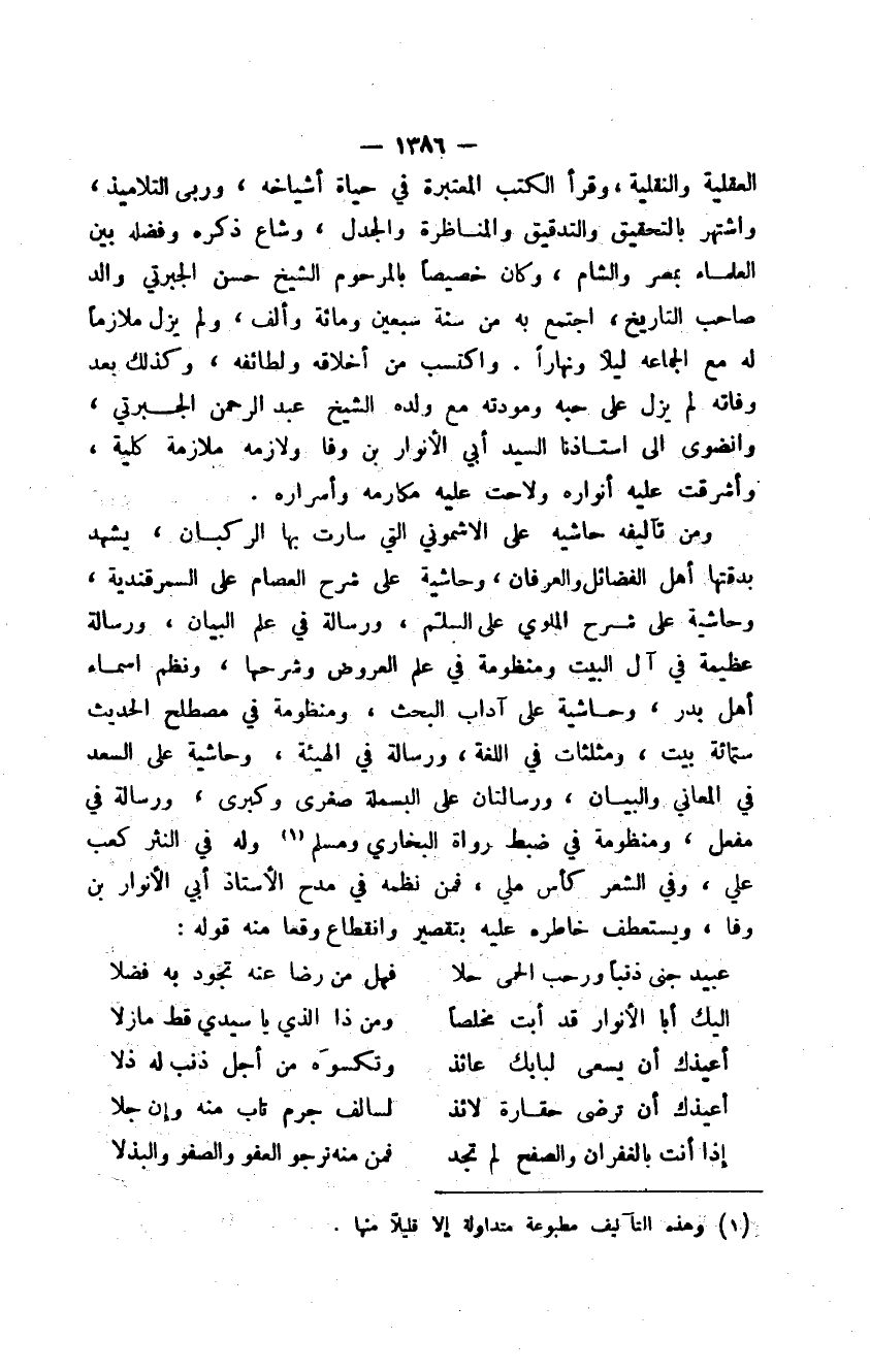 العقلية والنقلية، وقرأ الكتب المعتبرة في حياة أشياخه، وربى التلاميذ، واشتهر بالتحقيق والتدقيق والمناظرة والجدل، وشاع ذكره وفضله بين العلماء بمصر والشام، وكان خصيصاً بالمرحوم الشيخ حسن الجبرتي والد صاحب التاريخ، اجتمع به من سنة سبعين ومائة وألف، ولم يزل ملازماً له مع الجماعة ليلاً ونهاراً. واكتسب من أخلافه ولطائفه، وكذلك بعد وفاته لم يزل على حبه ومودته مع ولده الشيخ عبد الرحمن الجبرتي، وانضوى إلى أستاذنا السيد أبي الأنوار بن وفا ولازمه ملازمة كلية، وأشرقت عليه أنواره ولاحت عليه مكارمه وأسراره.
