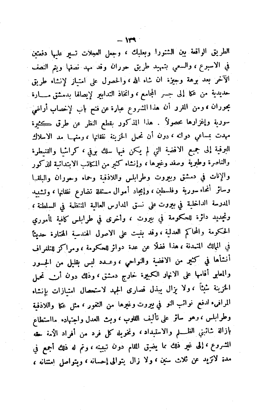 الطريق الواقعة بين الشتورا وبعلبك، وجعل العجلات تسير عليها دفعتين في الأسبوع، والسعي بتمهيد طريق حوران وقد مهد نصفها ويتم النصف الآخر بعد برهة وجيزة إن شاء الله، والحصول على امتياز لإنشاء طريق حديدية من عكا إلى جسر المجامع، واتخاذ التدابير لإيصالها بدمشق مارة بحوران، ومن المقرر أن هذا المشروع عبارة عن فتح باب لإخصاب أراضي سورية وإغزارها محصولاً. هذا المذكور بقطع النظر عن طرق كثيرة مهدت بمساعي دولته، دون أن تحمل الخزينة نفقاتها، ومنها مد الأسلاك البرقية إلى جميع الأقضية التي لم يكن فيها سلك برقي، كراشيا والقنيطرة والناصرة وطبرية وصفد وغيرها، وإنشاء كثير من المكاتب الابتدائية للذكور والإناث في دمشق وبيروت وطرابلس واللاذقية وحماه وحوران والبلقا وسائر أنحاء سورية وفلسطين، وإيجاد أموال مستقلة تضارع نفقاتها، وتشييد المدرسة الداخلية في بيروت على نسق المدارس العالية المنتظمة