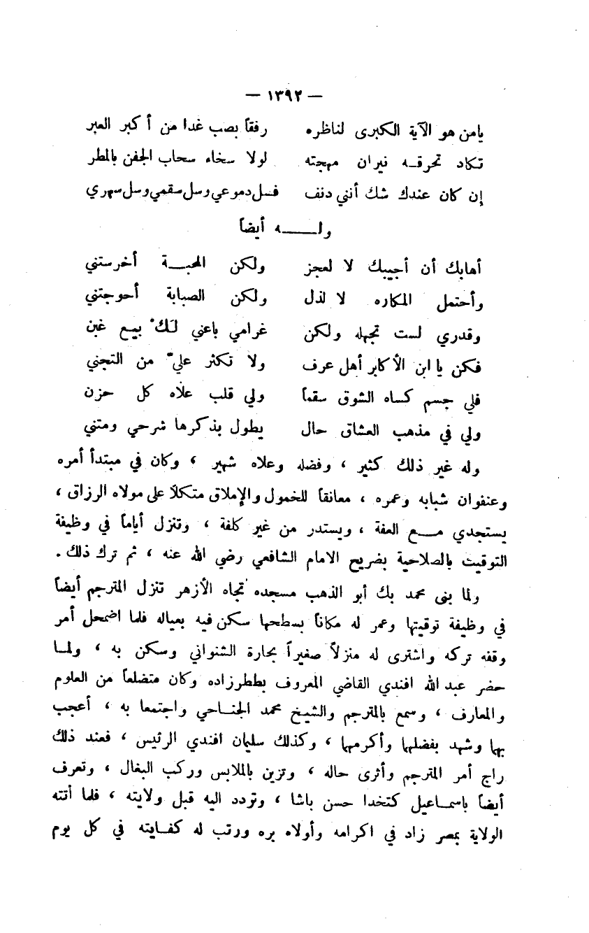 ولما بنى محمد بك أبو الذهب مسجده تجاه الأزهر تنزل المترجم أيضاً في وظيفة توقيتها وعمر له مكاناً بسطحها سكن فيه بعياله فلما اضمحل أمر وقفه تركه واشترى له منزلاً صغيراً بحارة الشنواني وسكن به، ولما حضر عبد الله أفندي القاضي المعروف بططرزاده وكان متضلعاً من العلوم والمعارف، وسمع بالمترجم والشيخ محمد الجناحي واجتمعا به، أعجب بهما وشهد بفضلهما وأكرمهما، وكذلك سليمان أفندي الرئيس، فعند ذلك راج أمر المترجم وأثرى حاله، وتزين بالملابس وركب البغال، وتعرف أيضاً بإسماعيل كتخدا حسن باشا، وتردد إليه قبل ولايته، فلما أتته الولاية بمصر زاد في إكرامه وأولاه بره ورتب له كفايته في كل يوم