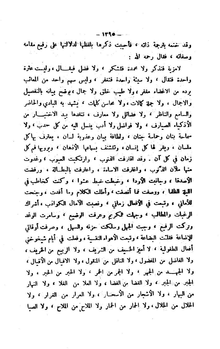 لا مزية فتذكر ولا محمدة فتشكر، ولا فضل فيقال، وليست عثرة واحدة فتقال، ولا سيئة واحدة فتغفر، وليس سهم واحد من المعائب يرده من الإغضاء مغفر، ولا طيب خلق ولا جمال، يوضح بيانه بالتفصيل والإجمال، ولا جملة كمالات، ولا محاسن كلمات، يشهد به البادي والحاضر والسامع والناظر، ولا فضائل ولا معارف، تنقدها بيد الإختبار من الأذكياء الصيارف، ولا فواضل ولا أدب ينسل إليه من كل حدب، ولا سماحة بنان وحماسة جنان، ولطافة بيان وعذوبة لسان، يعترف بها كل ماسان، ويقر لها كل إنسان، وتتشنف بسماعها الأذهان، ويرويها فم كل زمان في كل آن. وقد اقترفت الذنوب، وارتكبت العيوب، وغدوت منها ملآن الذنوب، واغترفت الإساءة، واغترفت بالبطالة ورفضت الأصدقا، وجانبت الأودا، وخبطت خبط عشوا، وكنت كخاطب في الليلة الظلما، ووصفت فما أنصفت، وأطلت الكلام وما أفدت، وجنحت للأماني، وتبعت في الأفعال زماني، ونصبت الآمال الكواذب، أشراك الرغبات والمطالب، وجهلت الكريم وعرفت الوضيع، وسامرت الوغد وتركت الرفيع، وجبت الجهل وسلكت حزنه والسهل، وصرفت أوقاتي للإضاعة فقلت البضاعة، وتبعت الأهواء النفسية، وفعلت في أيام شيخوختي أفعال الطفولية، لا أميز الخسيف من الشريف، ولا الربيع من الخريف، ولا الفاضل من المفضول، ولا الناقل من المنقول، ولا الأفيال من الأقيال، ولا الجهد من الجهر، ولا الجمر من الخمر، ولا الحبر من الحبر، ولا الجبر من الجبر، ولا القضا من الفضا، ولا العلا من الغلا، ولا النهار من البهار، ولا الأشجار من الأسحار، ولا العرار من الغرار، ولا الحلال من الخلال، ولا الحمار من الخمار ولا الملاح من الملاح، ولا الصبا