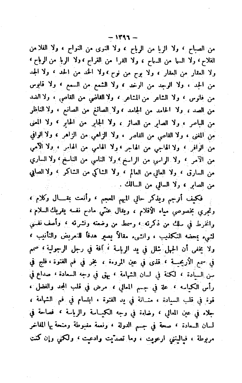 فكيف أترجم ويذكر حالي المبهم المعجم، وأنعت بمقال وكلام، وتجري بخصوصي مياه الأقلام، ويقال عني مادح نفسه يقريك السلام، وانخرط في سلك من ذكرته، وسمط من وضعته ونشرته، وأصف نفسي لشيء يمحضه التكذيب، وأنشئ مقالاً يصير هدفاً للتعريض والتأنيب، ولا يخفى أن الجهل شلل في يد الرياسة، آفة في رجل الرجولية، صمم في سمع الأريحية، قذى في عين المروءة، بخر في فم الفتوة، فلج في سن السيادة، لكنه في لسان الشهامة، بهق في وجه السعادة، صداع في رأس الكياسة، علة في جسم المعالي، مرض قي قلب المجد والفضل، قوة في قلب السيادة، متانة في يد الفتوة، ابتسام في فم الشهامة، جلاء في عين المعالي، وضاءة في وجه الكياسة والرياسة، فصاحة في لسان السعادة، صحة في جسم الدولة، ونعمة مغبوطة ومنحة بها المفاخر مربوطة، فيا ليتني ارعويت، وما تصديت وادعيت، ولكني وإن كنت