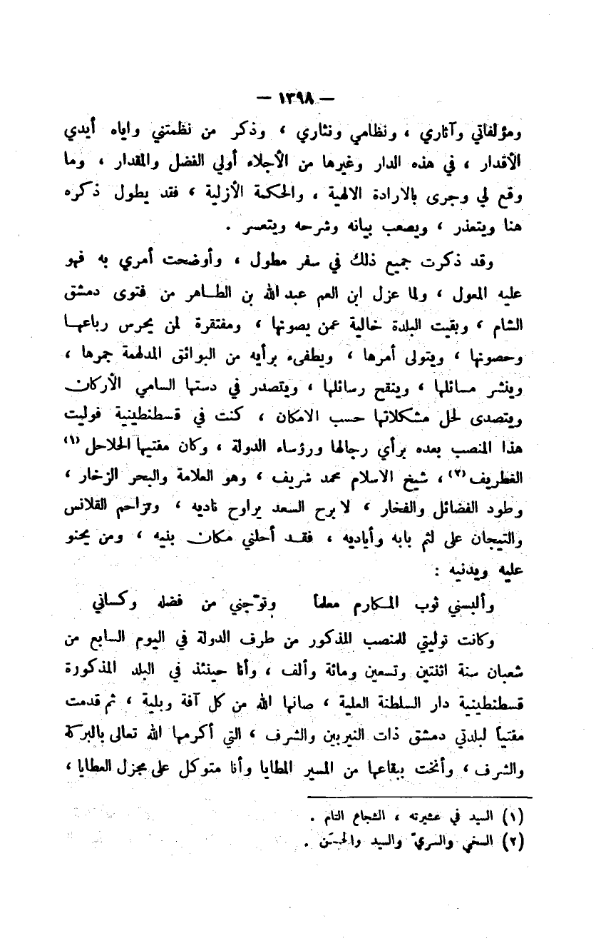 وقد ذكرت جميع ذلك في سفر مطول، وأوضحت أمري به فهو عليه المعول، ولما عزل ابن العم عبد الله بن الطاهر من فتوى دمشق الشام، وبقيت البلدة خالية عمن يصونها، ومفتقرة لمن يحرس رباعها وحصونها، ويتولى أمرها، ويطفئ برأيه من البوائق المدلهمة جمرها، وينشر مسائلها، وينقح رسائلها، ويتصدر في دستها السامي الأركان ويتصدى لحل مشكلاتها حسن الإمكان، كنت في قسطنطينية فوليت هذا المنصب بعده برأي رجالها ورؤساء الدولة، وكان مفتيها الحلاحل الغطريف، شيخ الإسلام محمد شريف، وهو العلامة والبحر الزخار، وطود الفضائل والفخار، لا برح السعد يراوح ناديه، وتزاحم القلانس والتيجان على لثم بابه وأياديه، فقد أحلني مكان بنيه، ومن يحنو عليه ويدنيه: